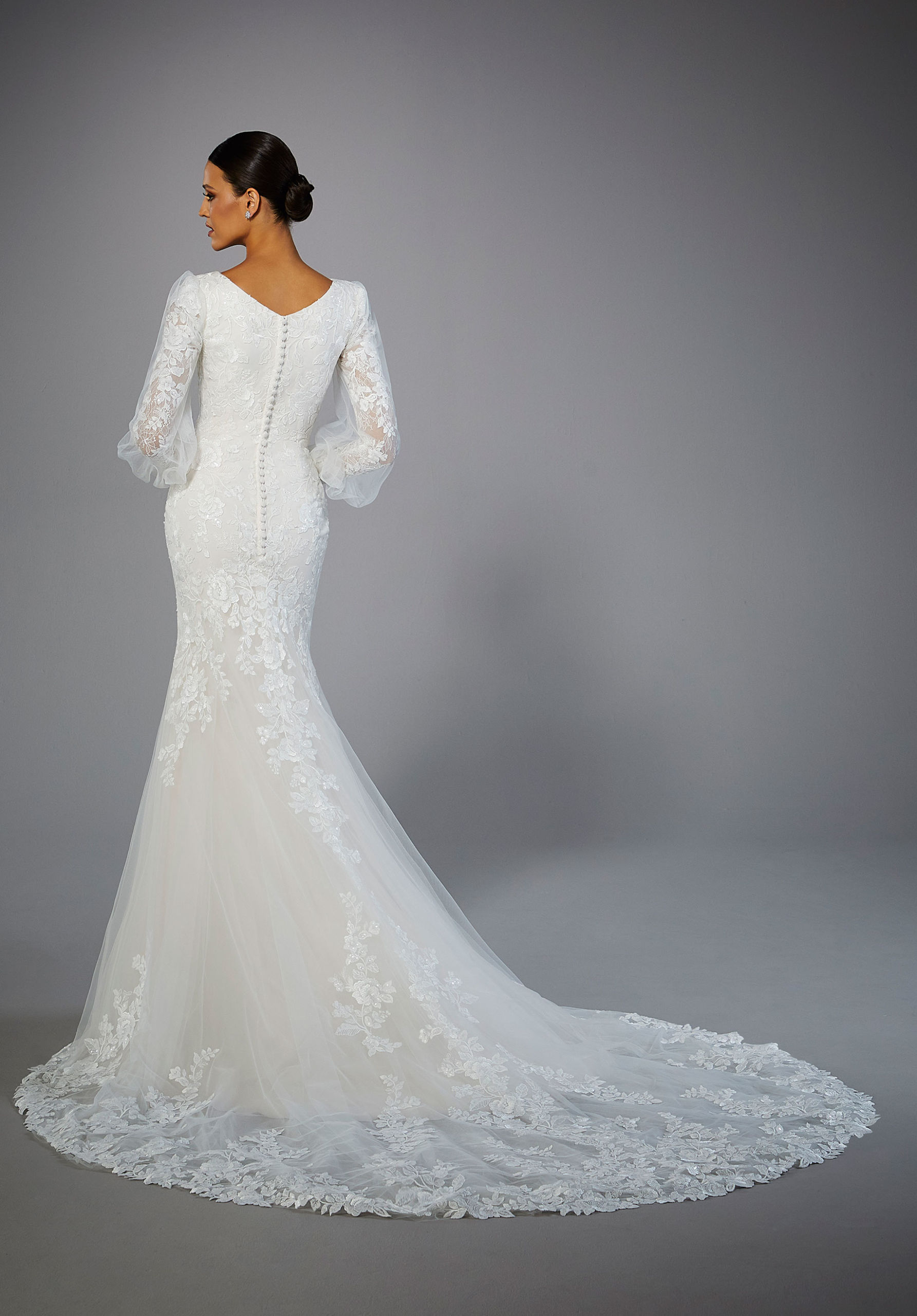 Classic fit and flare has lovely embroidered lace appliqués on a illusion sleeves with a sheer bishop overlay and dreamy sheer train.