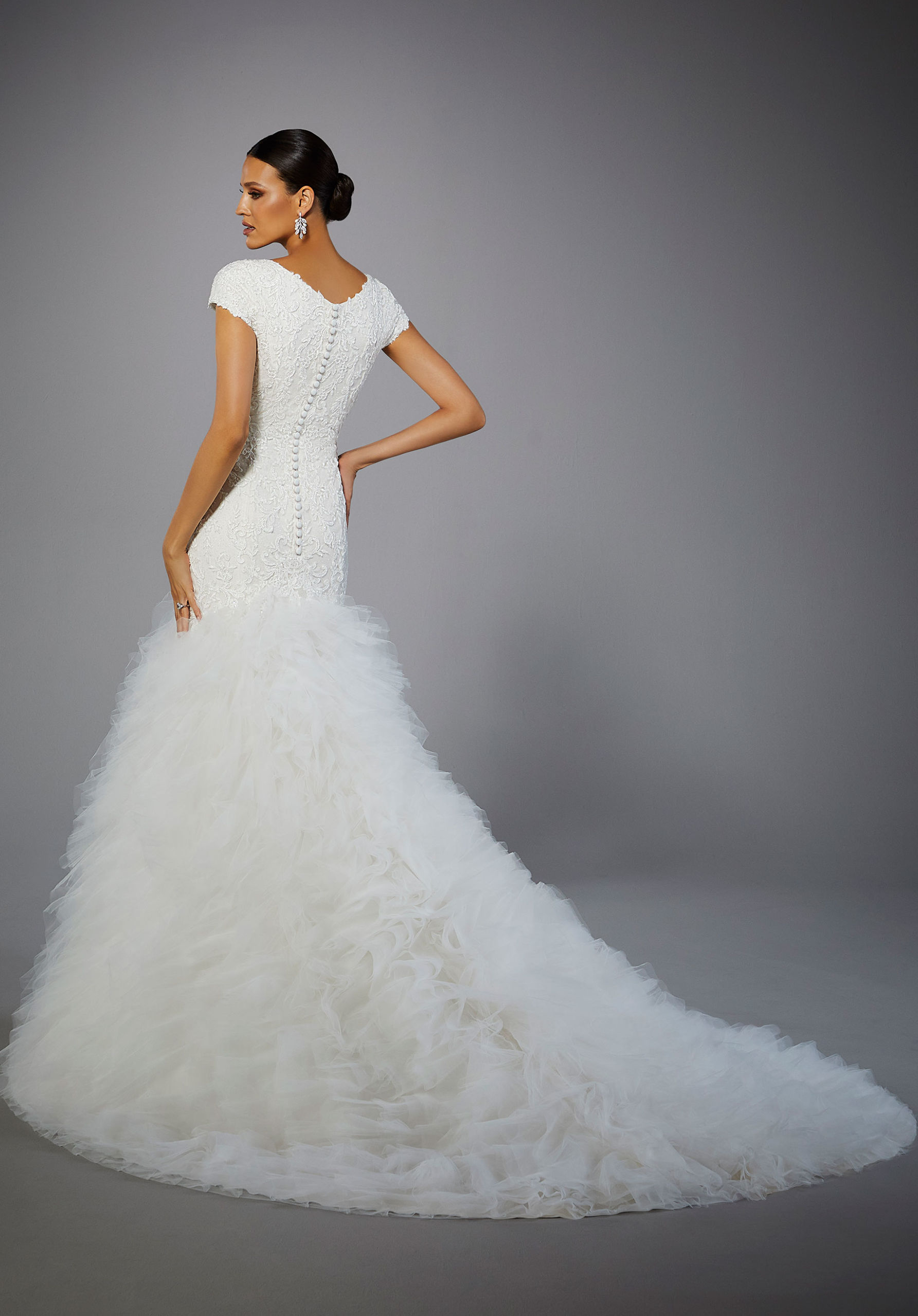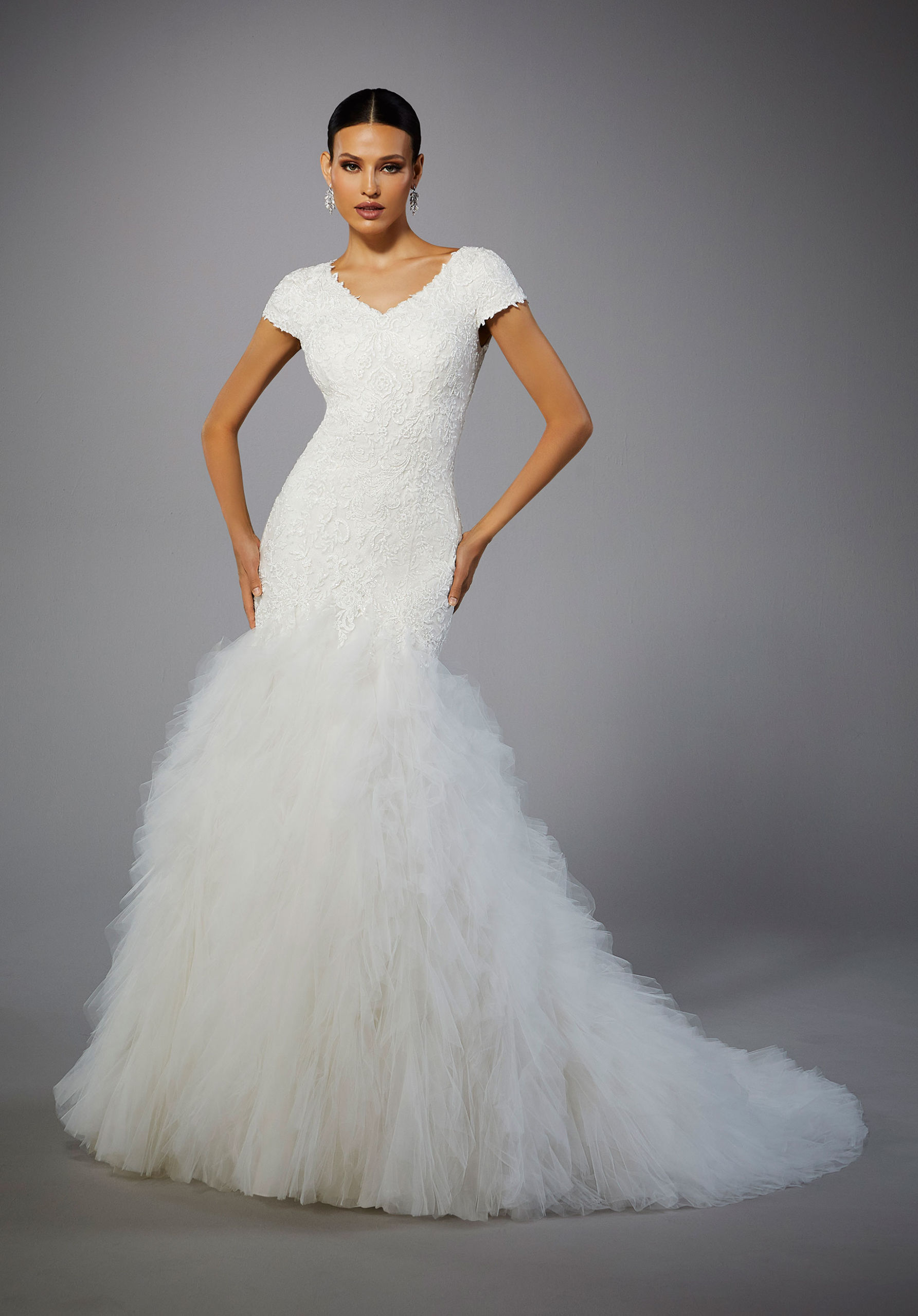 Stunning mermaid has a medallion embroidered drop waist bodice with a v-neck and short sleeves and a fabulous ruffled tulle skirt.
