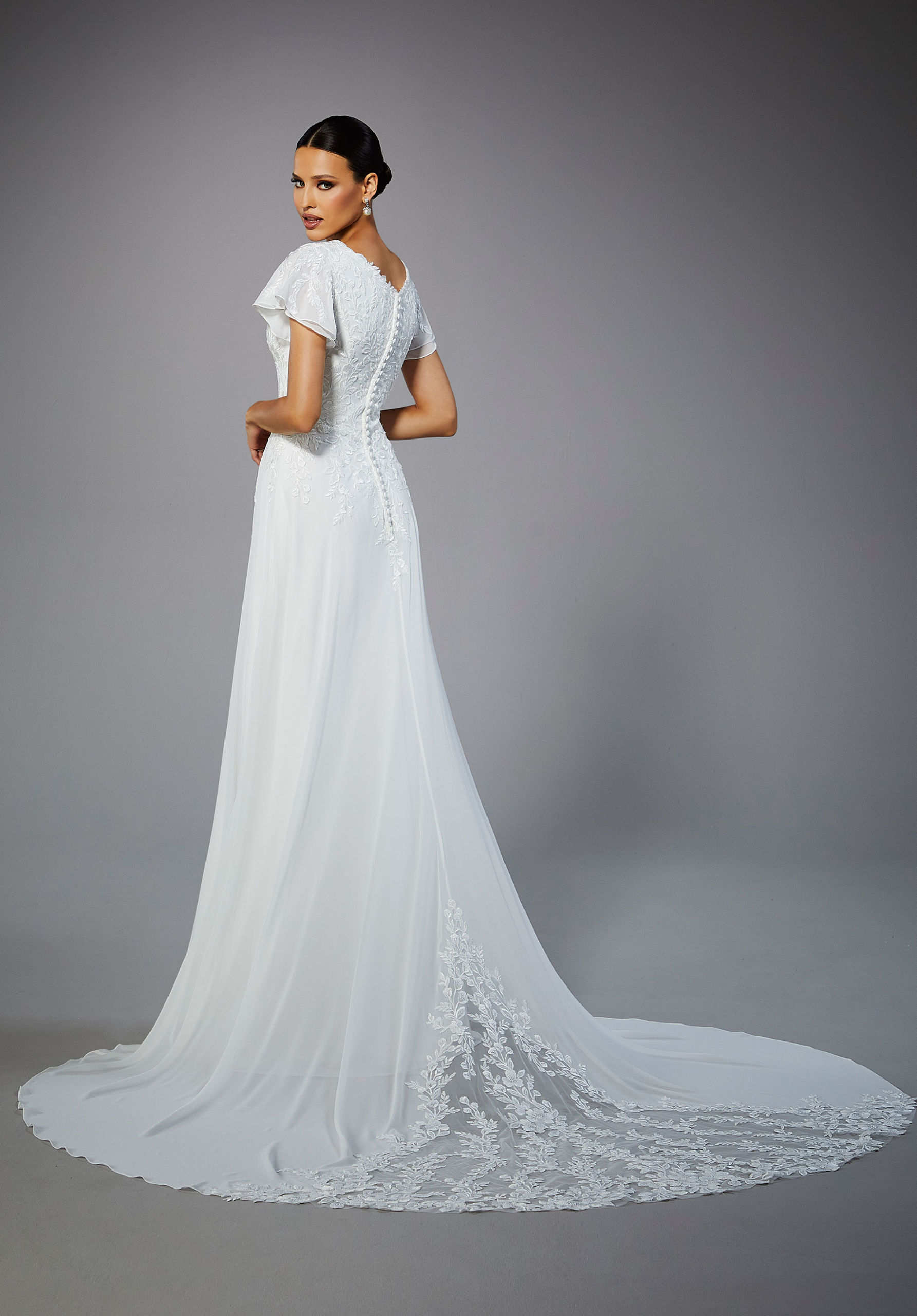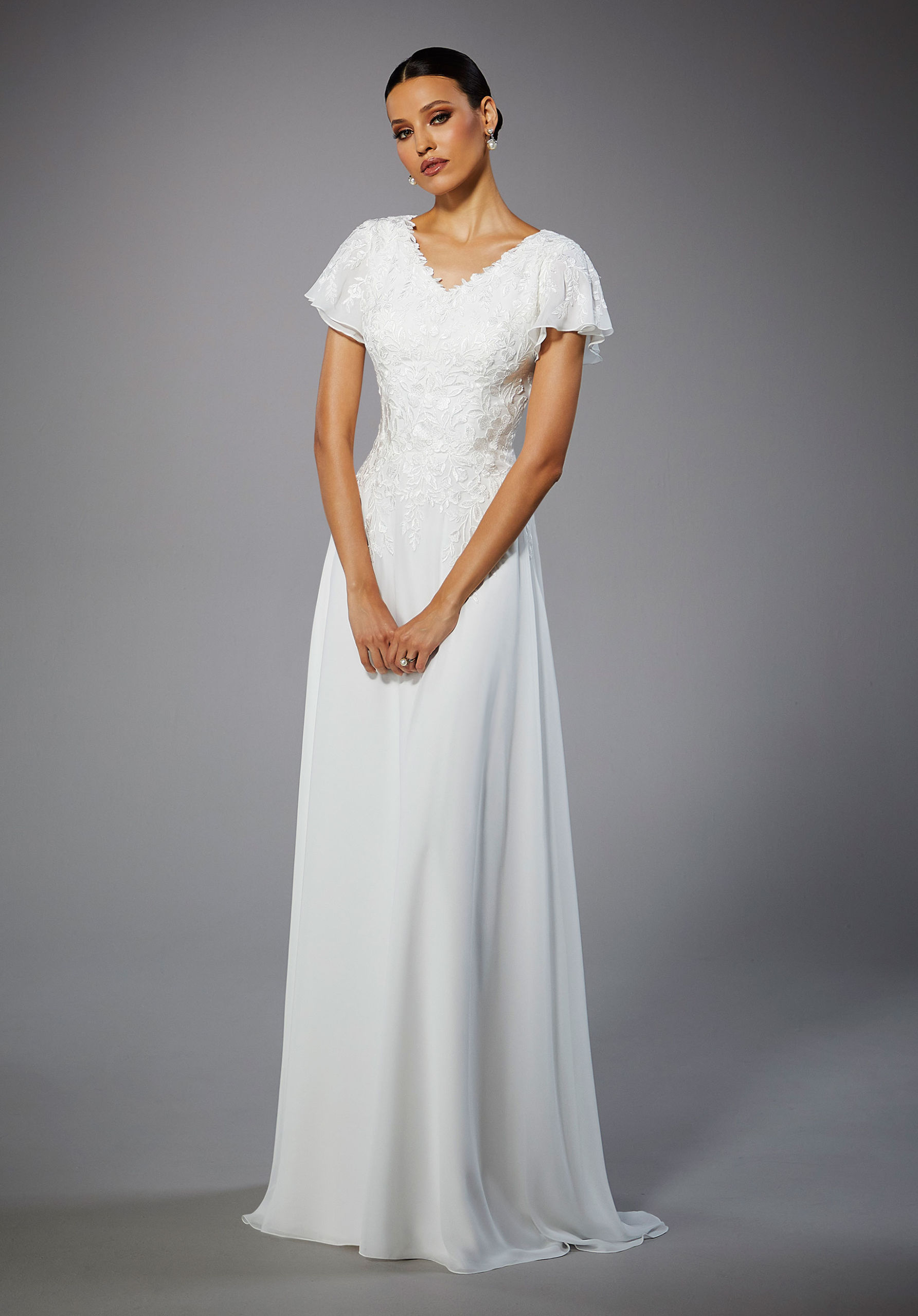 Relaxed A-line has a delicate embroidered lace bodice with feminine flutter sleeves on an effortless chiffon skirt.