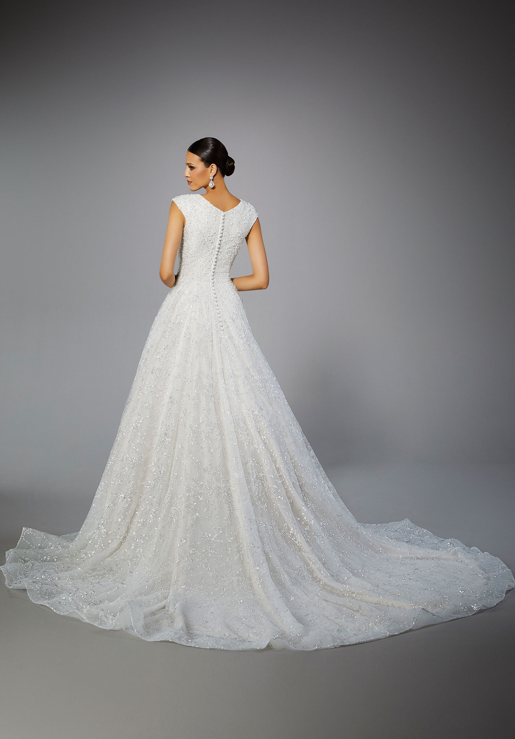 Glimmering ball gown has an allover pearl and crystal beaded bodice on a pattern sequin tulle skirt for the ultimate sparkle.