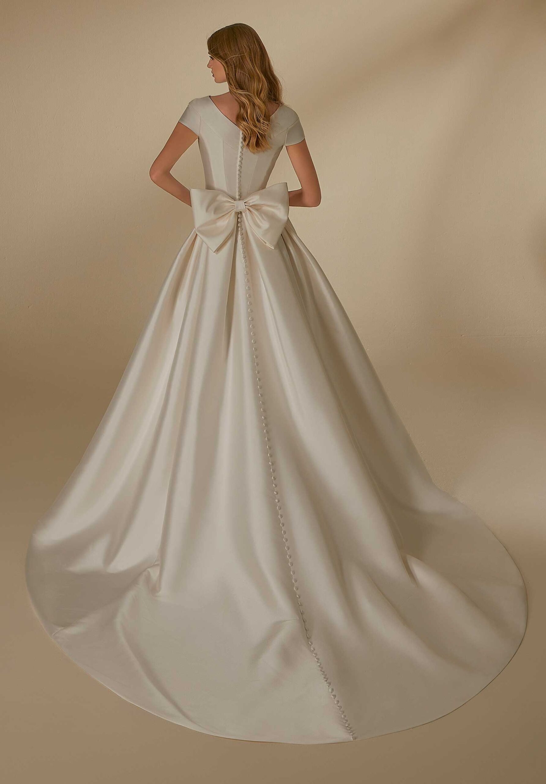 Modern and modest A-line with contoured seaming on the bodice to create unique shapes on a classic Larissa satin box pleated skirt. Detachable back bow adds drama.