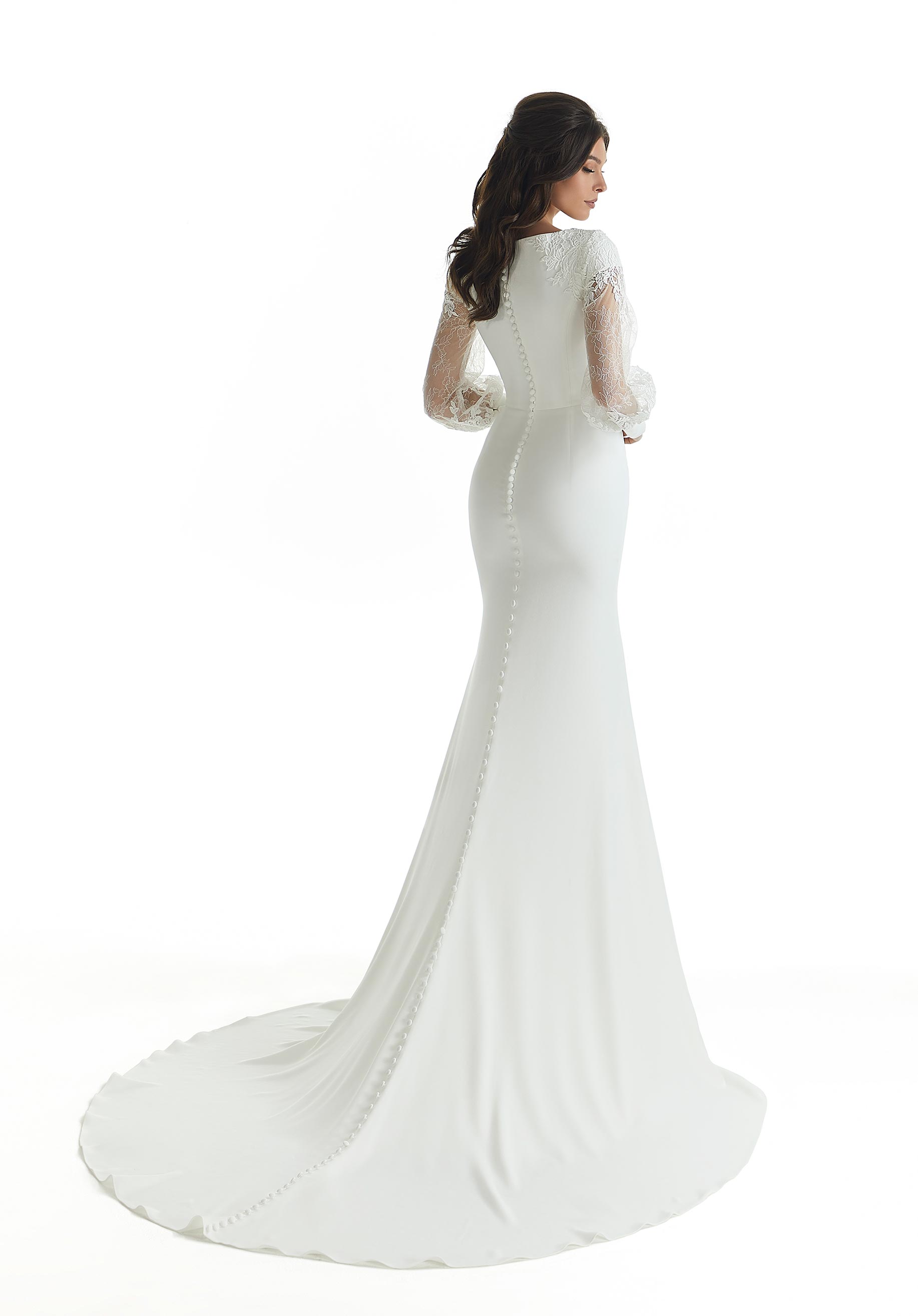 Simple crepe fit and flare has a bateau neckline and Chantilly lace sleeves with frosted Venice lace appliqués