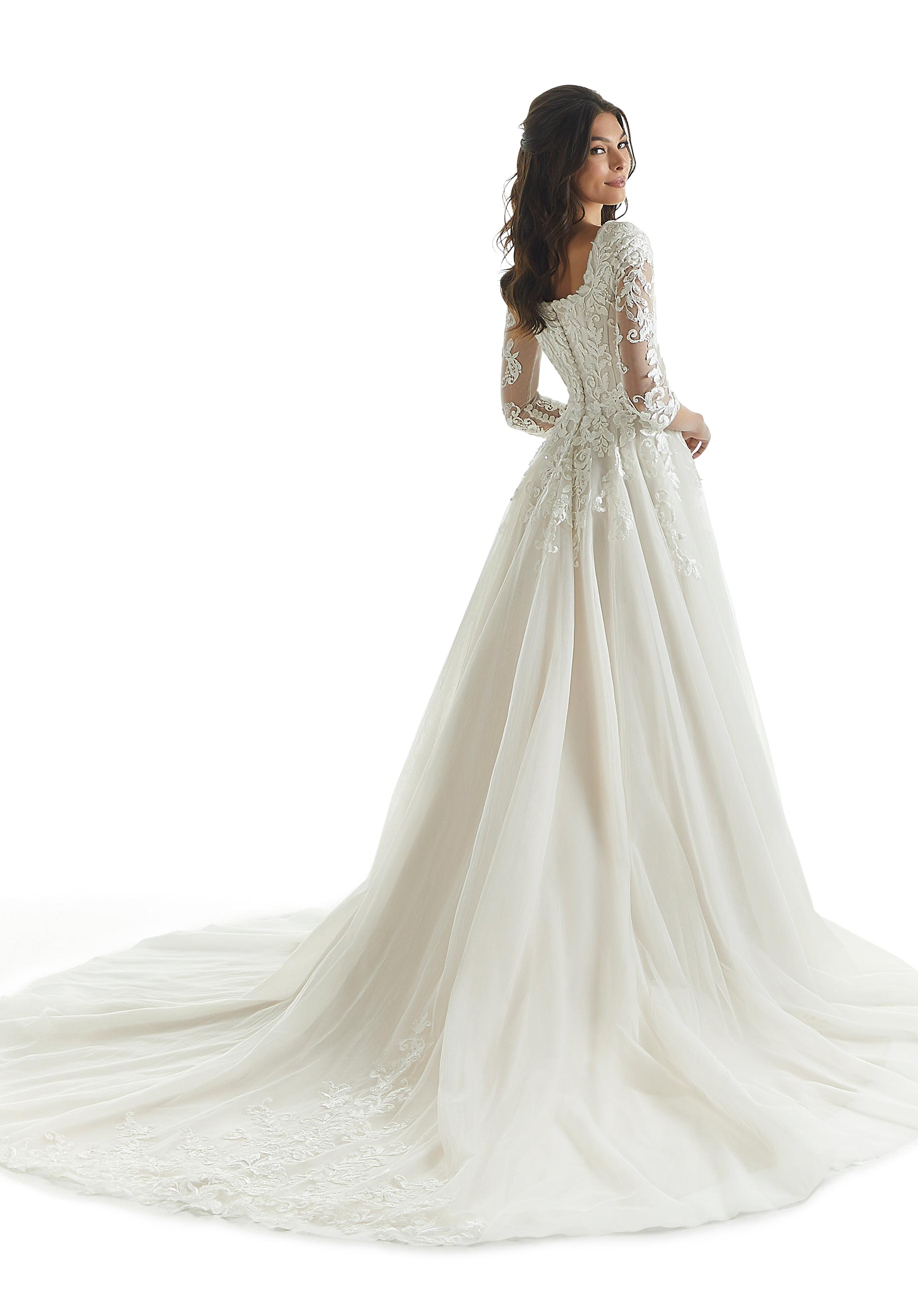 Traditional ball gown has a square neckline bodice with frosted, embroidered lace appliqués with illusion 3/4 sleeves and full tulle skirt.