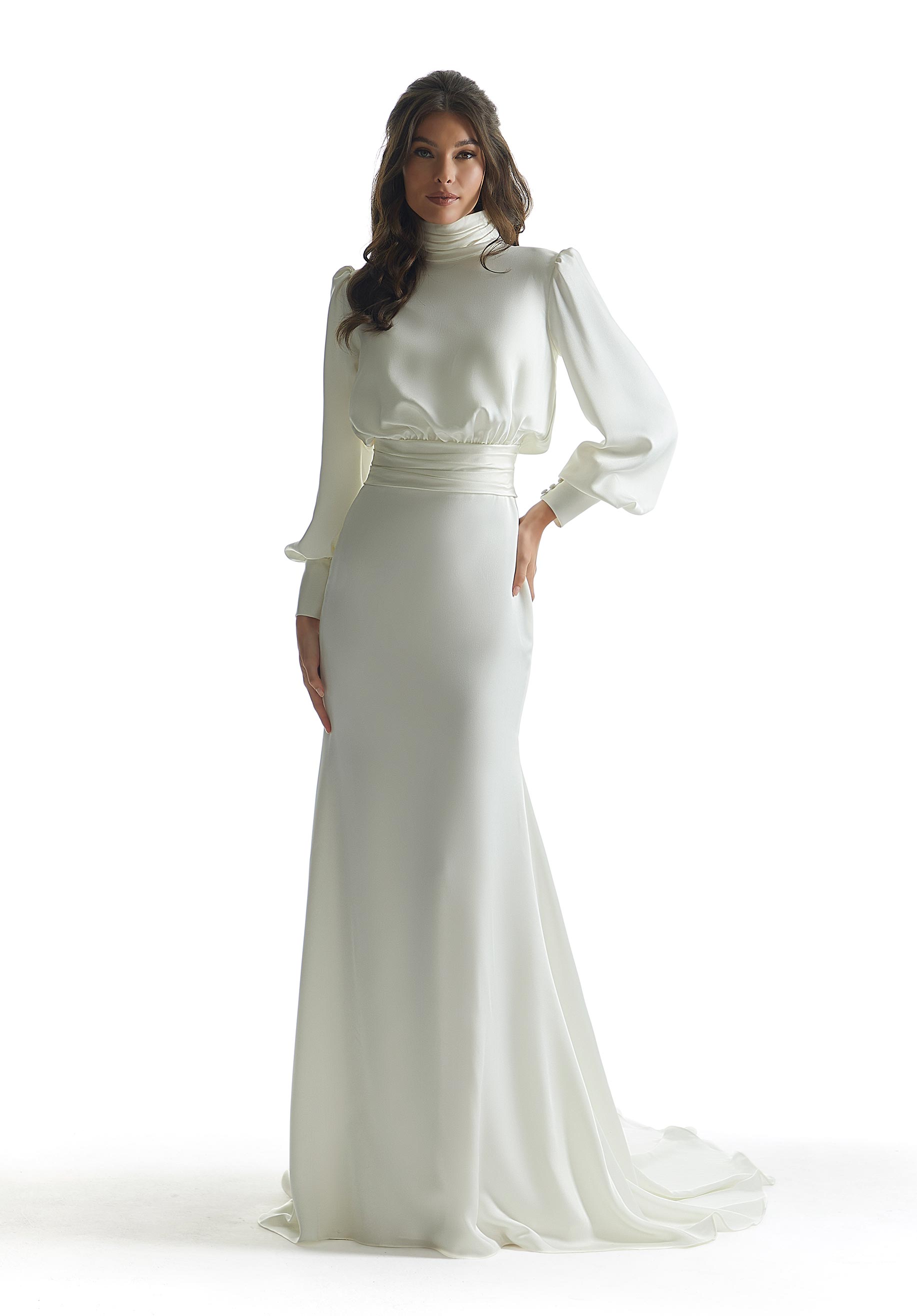 Vintage-inspired fit and flare glows in soft stretch satin with a high neckline, delicate bishop sleeves, and a banded waist.