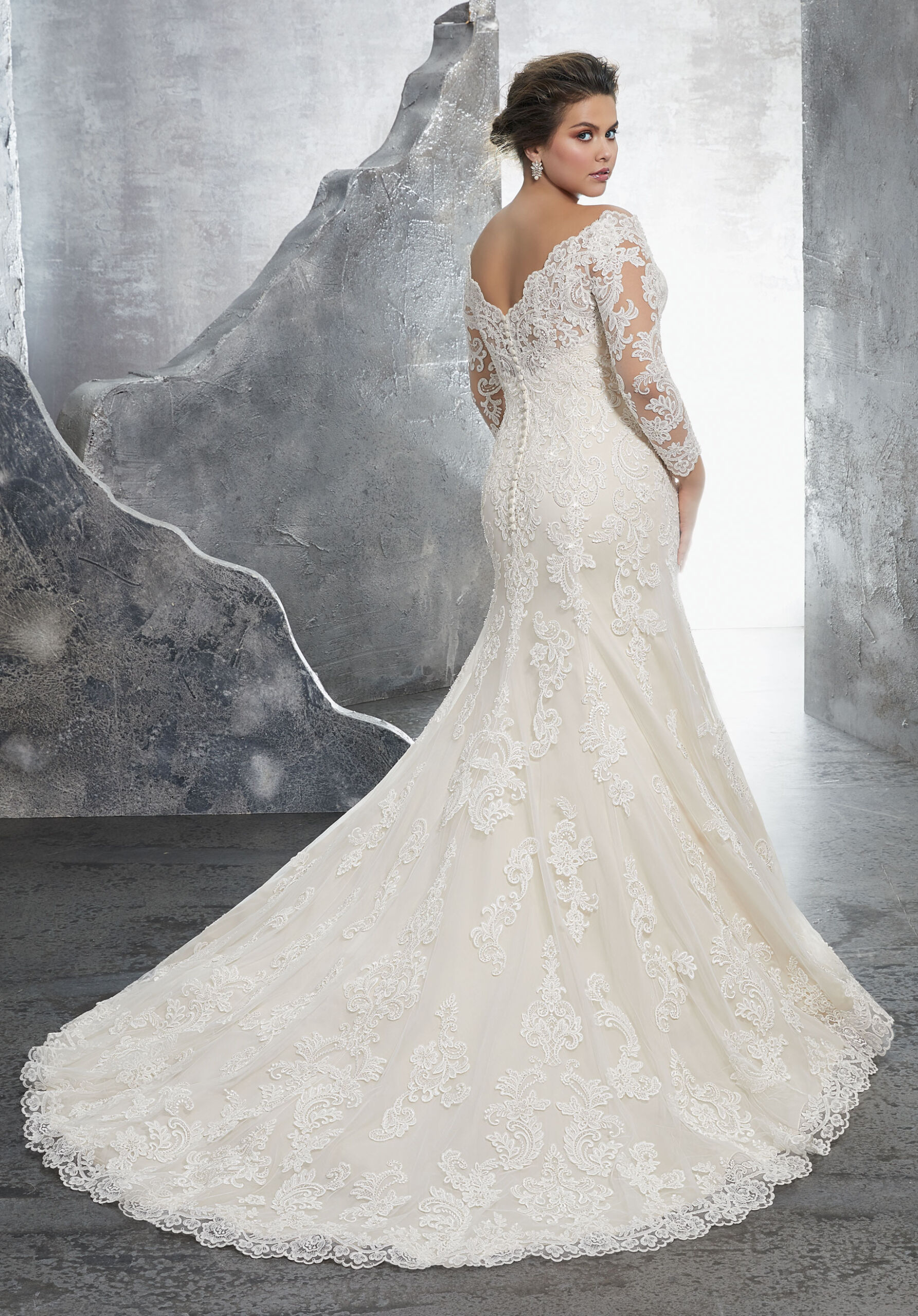 Home / Wedding Dresses / Morilee Wedding Dresses / Julietta Collection Wedding Dresses / 3231 KAMERON Wedding DressThis elegant long sleeve Kameron designer wedding dress features crystallized Alençon lace appliqués and medallions on net. Available in white, ivory, and ivory/coco, the off-the-shoulder neckline and scalloped hemline complete the sheath silhouette of this designer wedding dress.