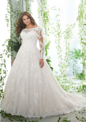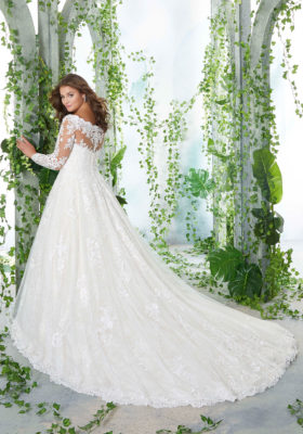 Home / Wedding Dresses / Morilee Wedding Dresses / Julietta Collection Wedding Dresses / 3258 PATIENCE Wedding DressesFrosted, Embroidered Lace Appliqués on a Soft Tulle Ball Gown Over Chantilly Lace with Scalloped Hemline and Long Sleeves.