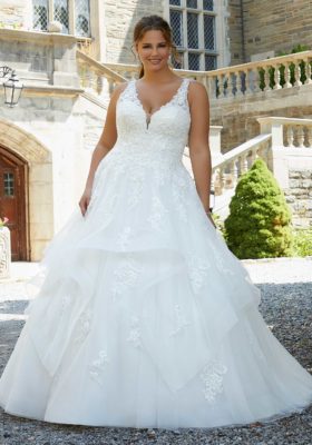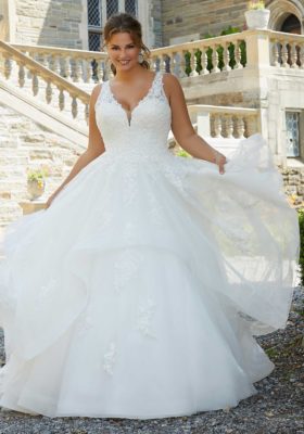 Home / Wedding Dresses / Morilee Wedding Dresses / Julietta Collection Wedding Dresses / 3284 SHARONA Wedding DressesThe Sharona wedding gown features crystal and pearl beaded lace appliqués on a tulle ball gown with flounced overlay and horsehair edging.