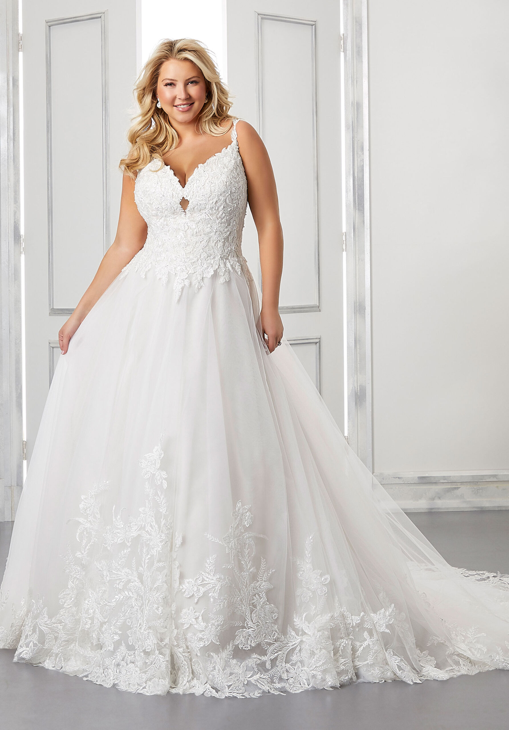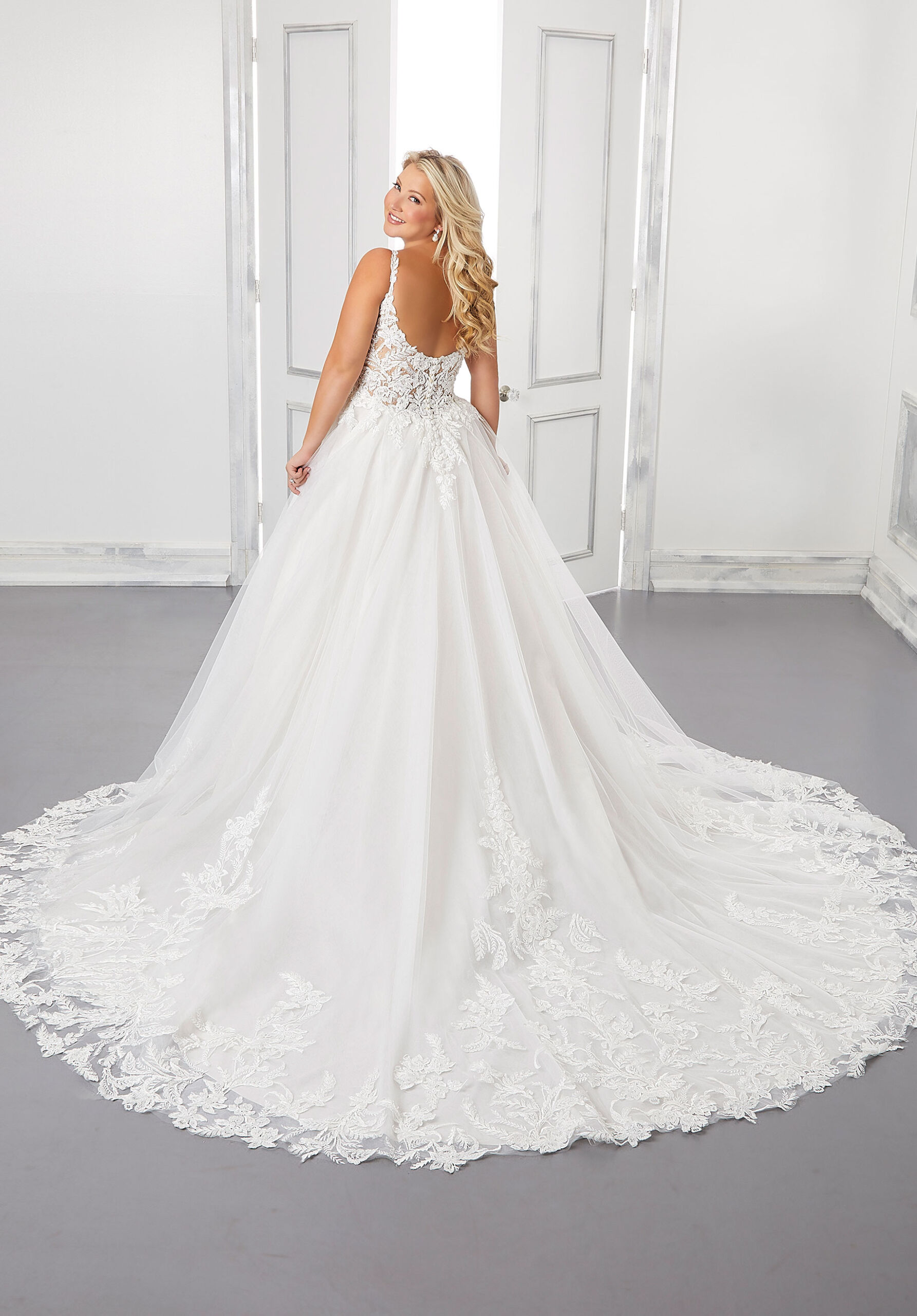 Home / Wedding Dresses / Morilee Wedding Dresses / Julietta Collection Wedding Dresses / 3313 BRITANNIA Wedding DressBritannia beautiful Tulle ball gown with frosted, embroidered appliqués accented by brilliant pearl and crystal beading. The structured v-neck bodice features a small keyhole and thin, yet supportive, straps that lead to a scoop back with intricate sheer aapliqués. A wide scalloped hemline completes this luxe gown.