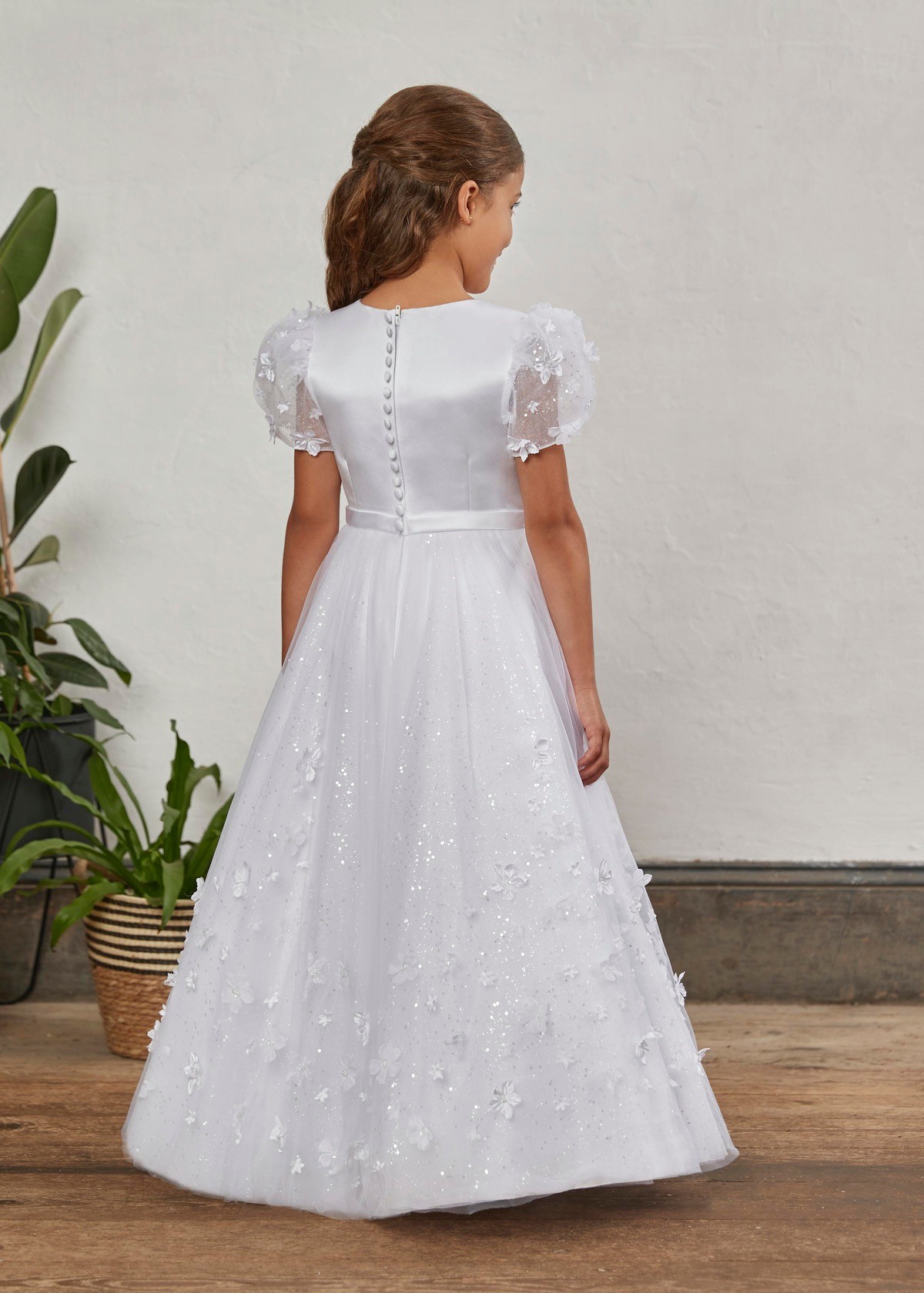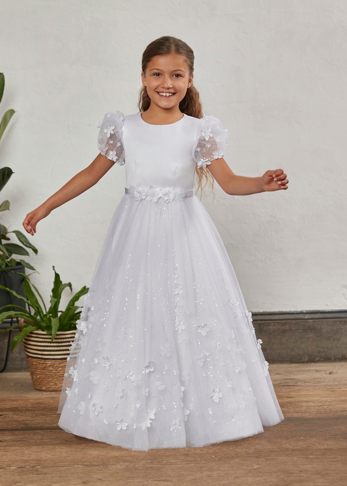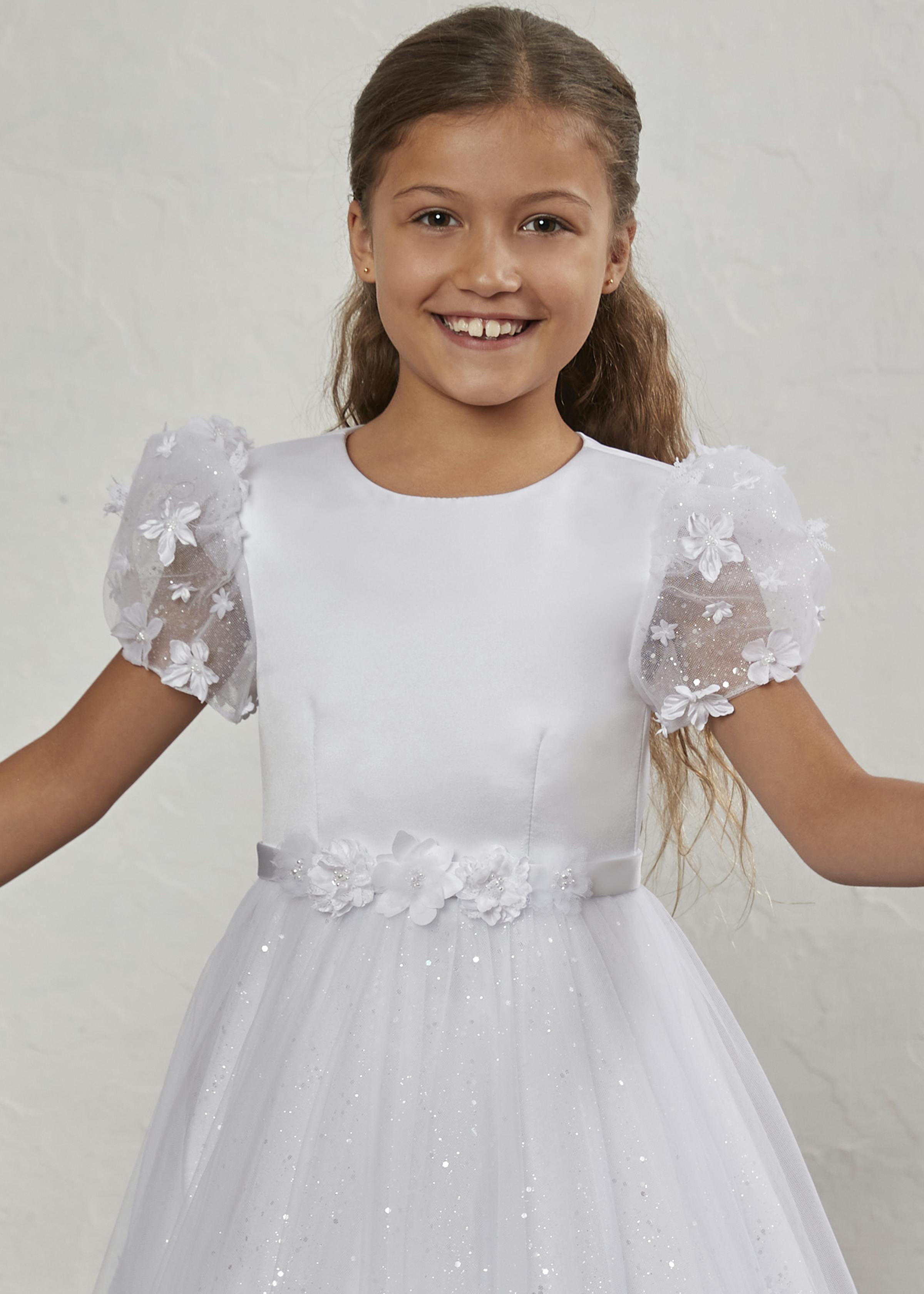 A sparkle skirt and sleeve is what makes this dress special. the flowers on the belt and the buttons on the back are perfect with this dress