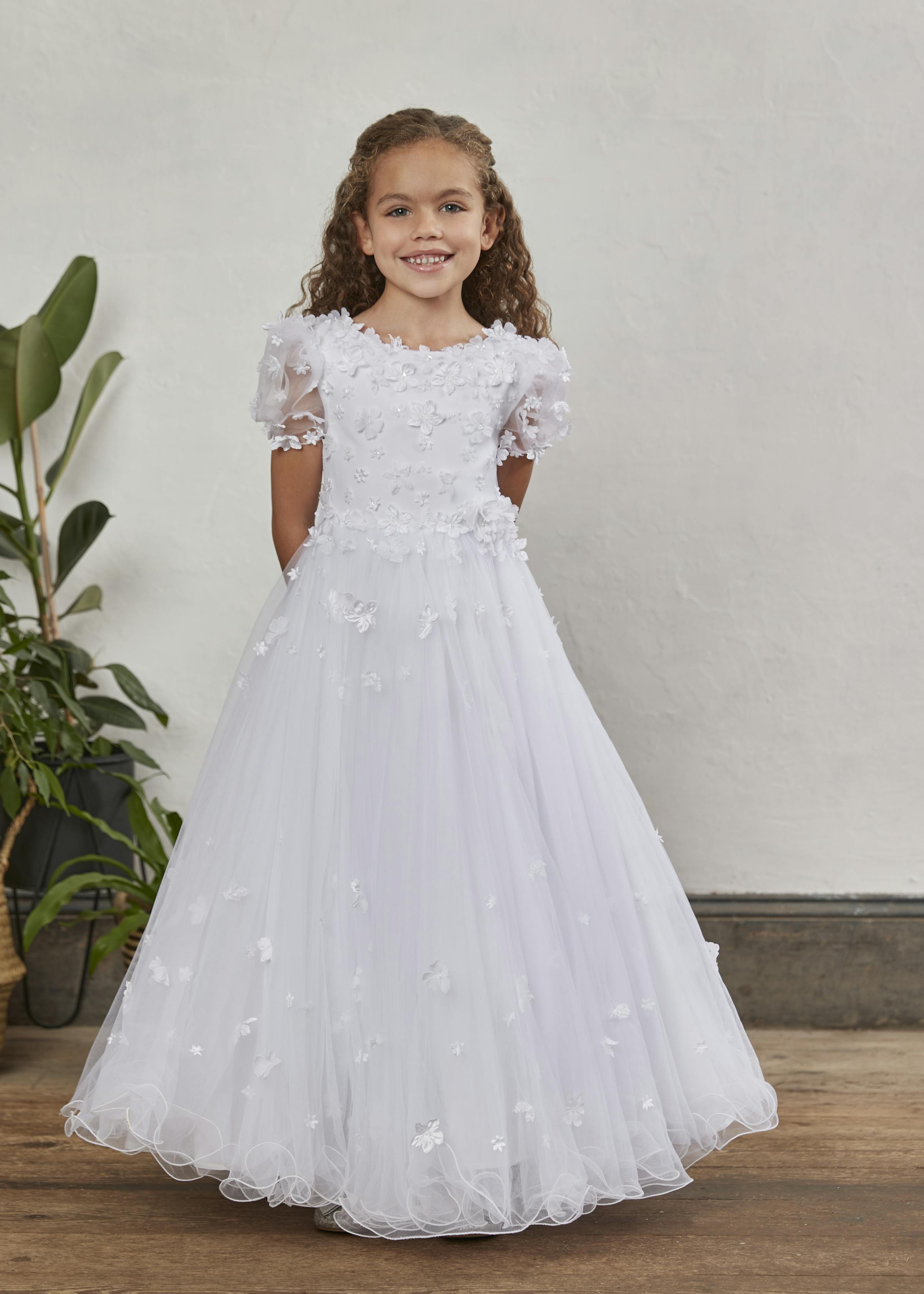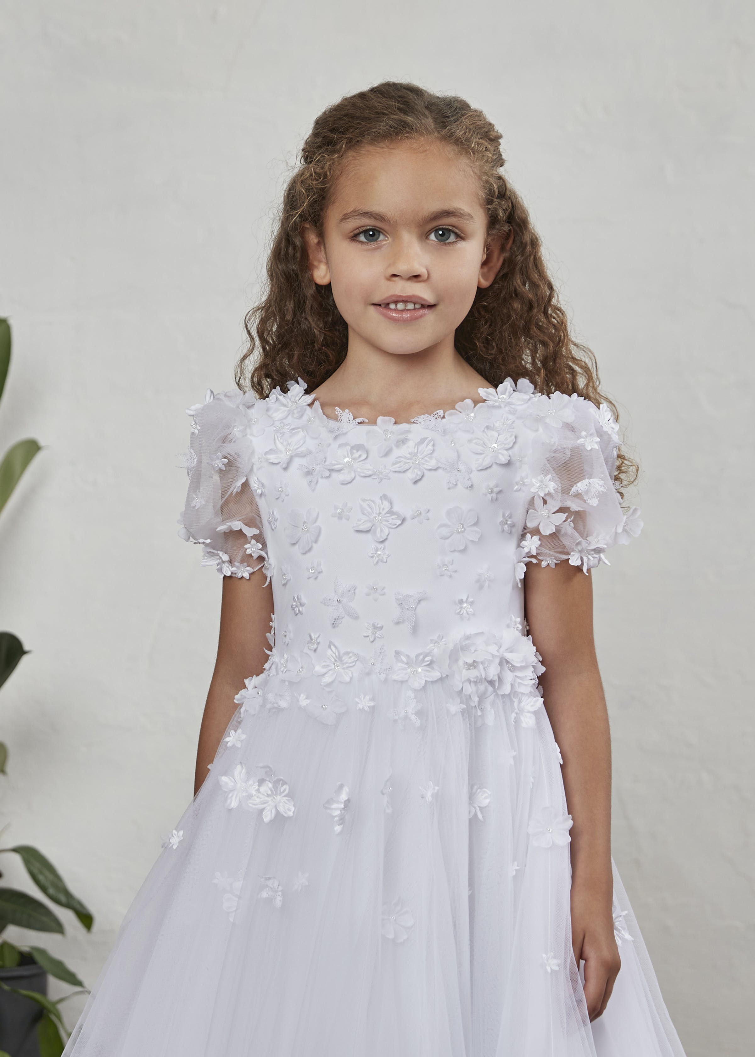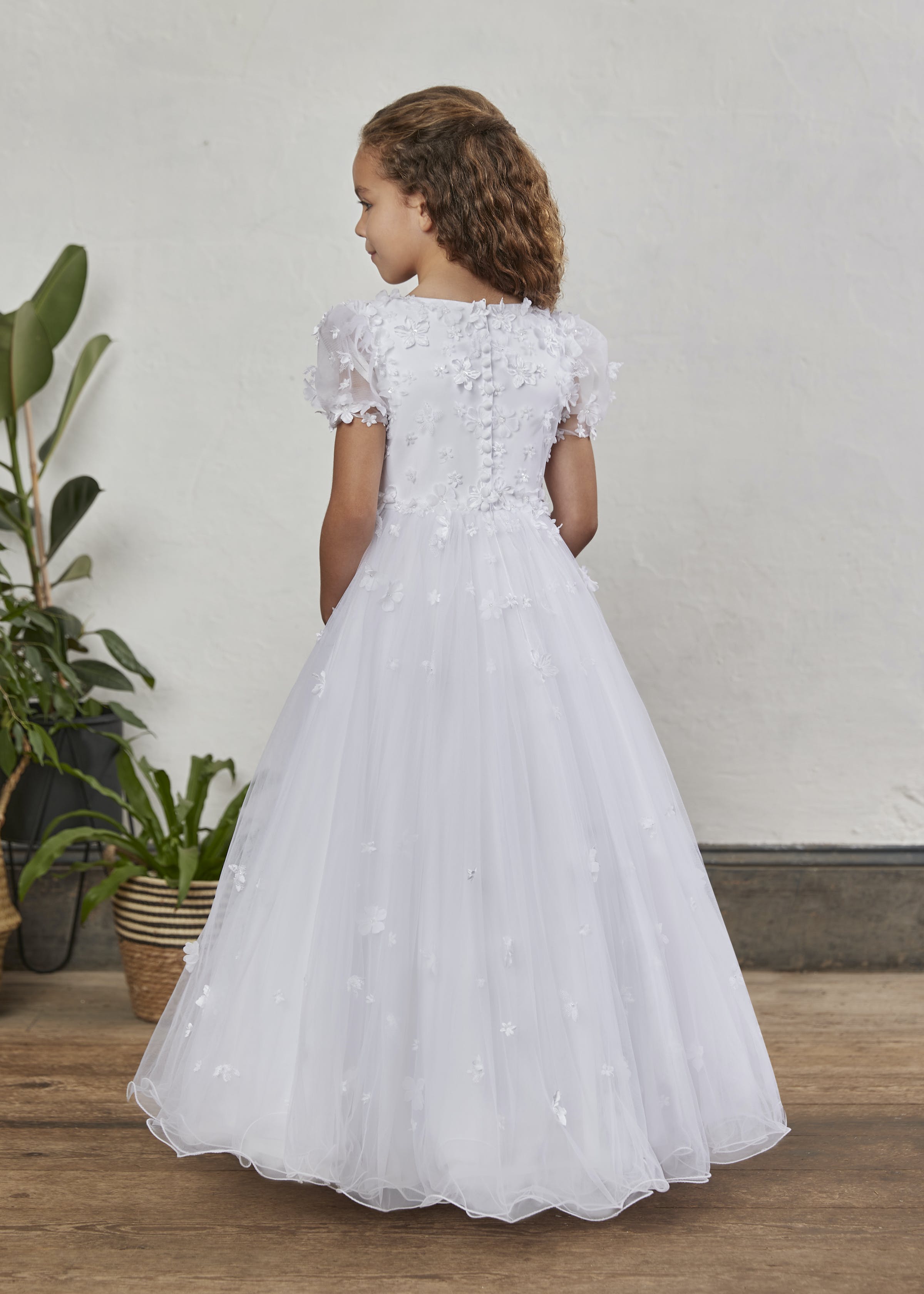 A beautiful and delicate communion dress with delicate flowers scattered on the bodice and end of the dress. The puff sleeves suit the dress perfectly