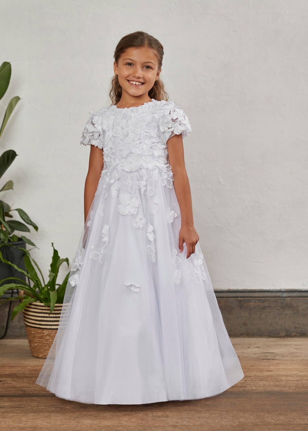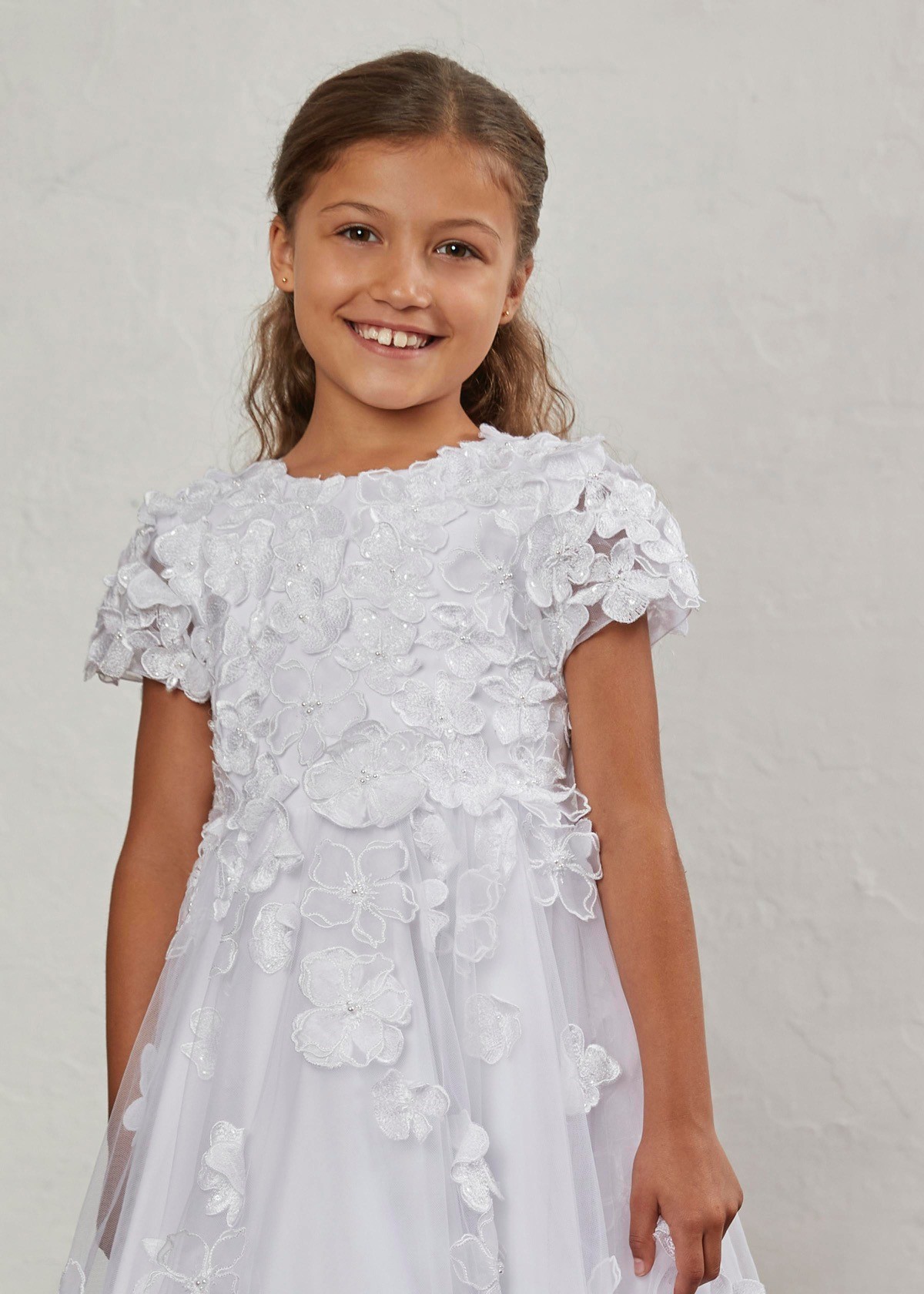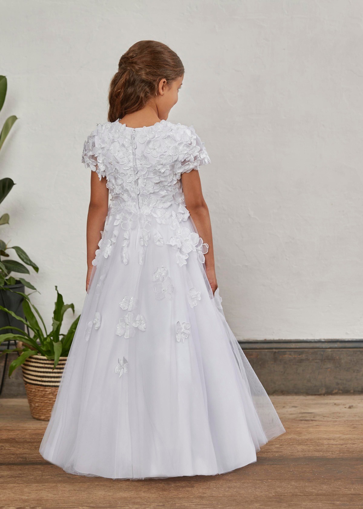 A beautiful communion dress with an A line skirt. The dress has a short sleeve and the bodice and skirt are covered in white flowers with a little pearl detail. Buttons on the back finish this dress beautifully