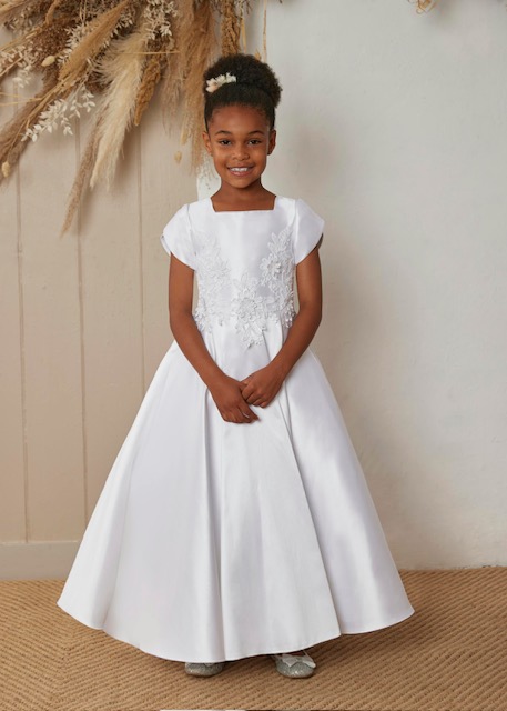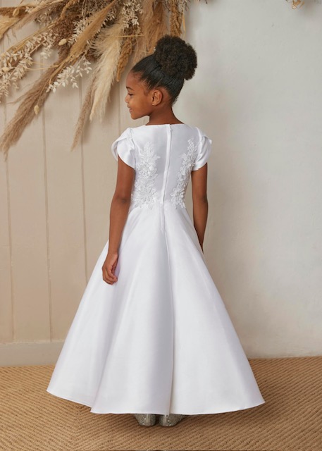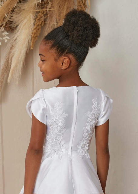 A gorgeous satin dress with a tulip sleeve makes this dress so simple for communion