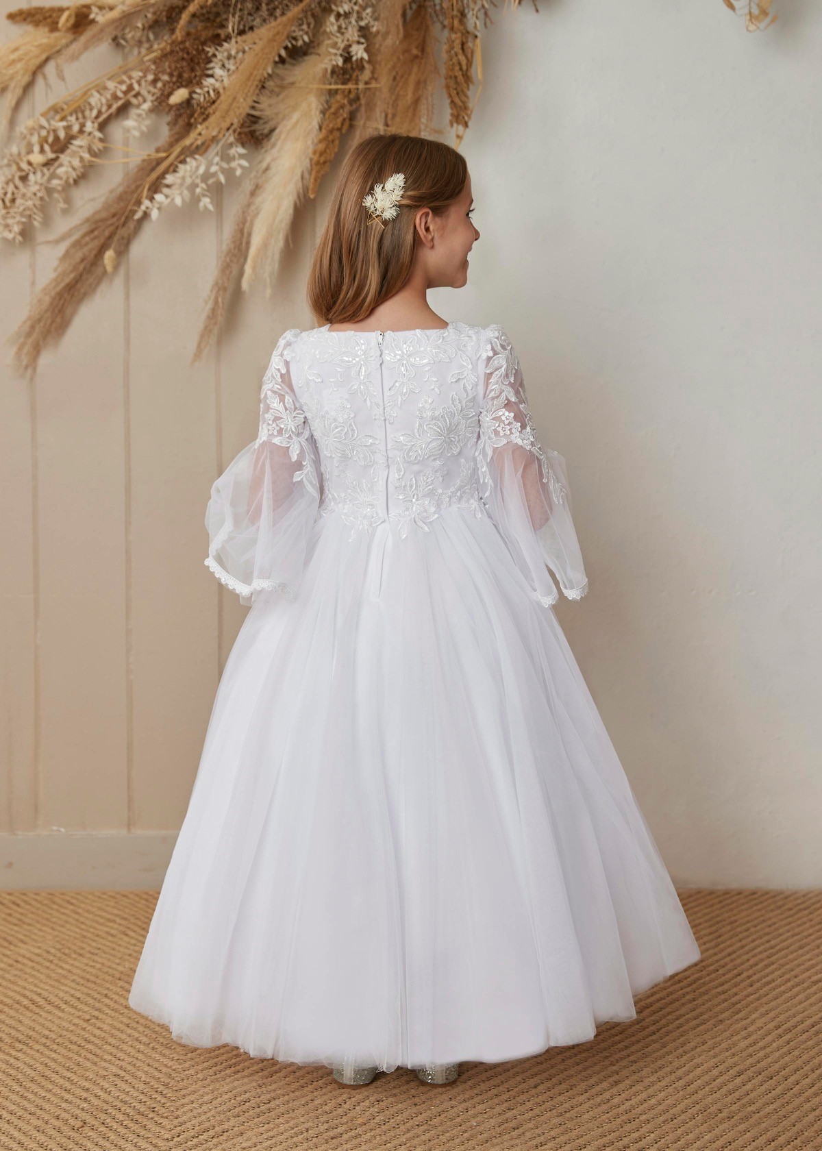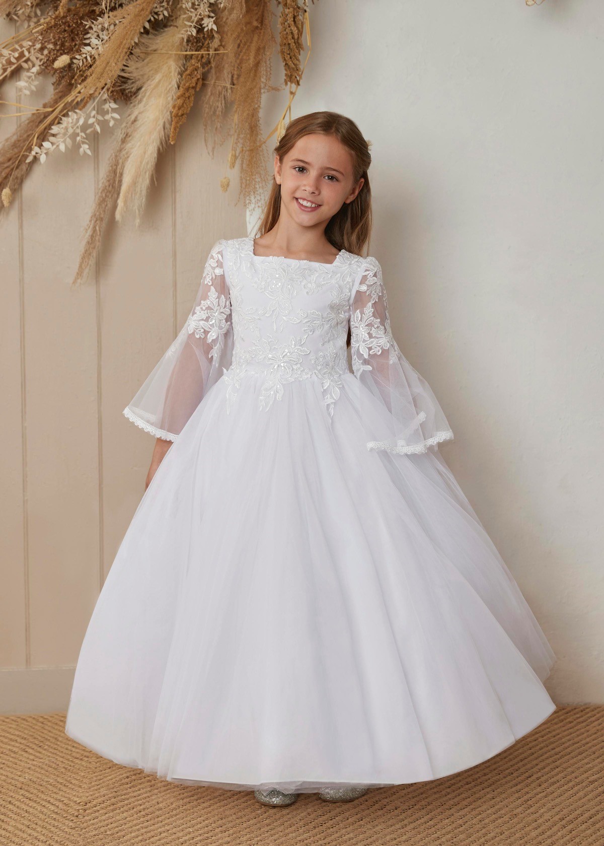 The bell sleeve on this dress is so unusual that your little girl will love it for her big day. Lace appliques and a square neckline make up the bodice and its matched witha plain tulle skirt