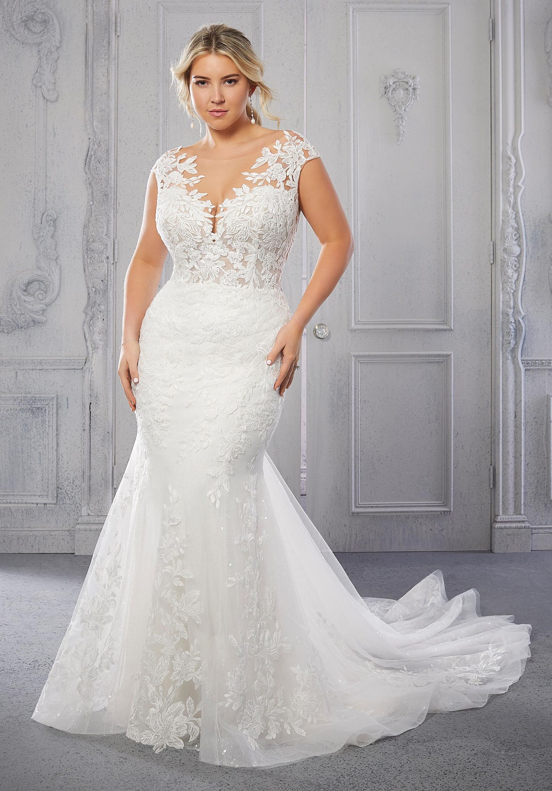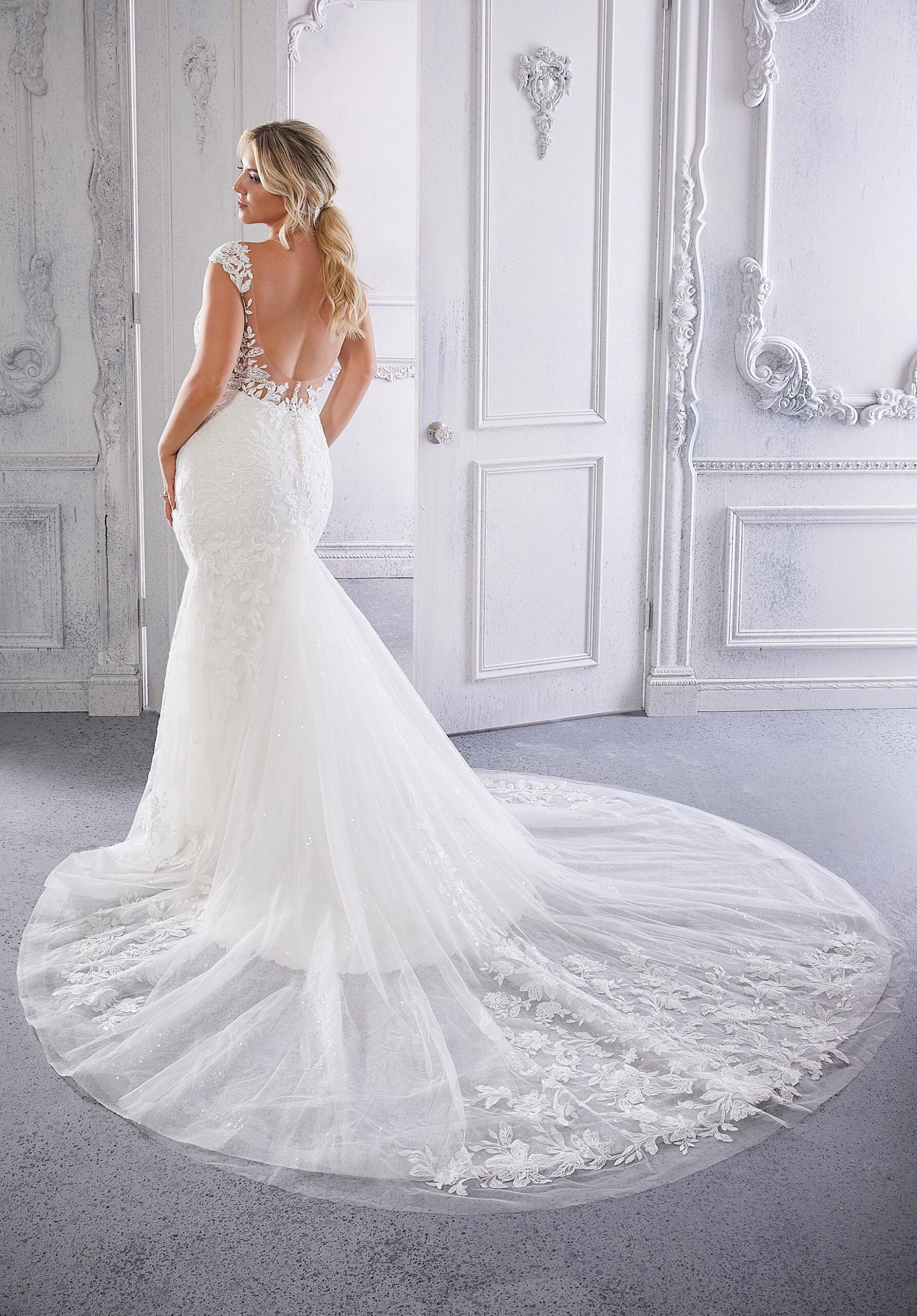 Home / Wedding Dresses / Morilee Wedding Dresses / Julietta Collection Wedding Dresses / 3329 Coco - Morilee Wedding DressCoco will make you look like the bridal babe you are with her curve-hugging, fit and flare silhouette. The illusion neckline shows off the perfect amount of décolletage and is beautifully designed with frosted, embroidered lace appliqués on sequined net. The low, scoop back and sheer godet train add decadent drama and crystal buttons bring on the bling.