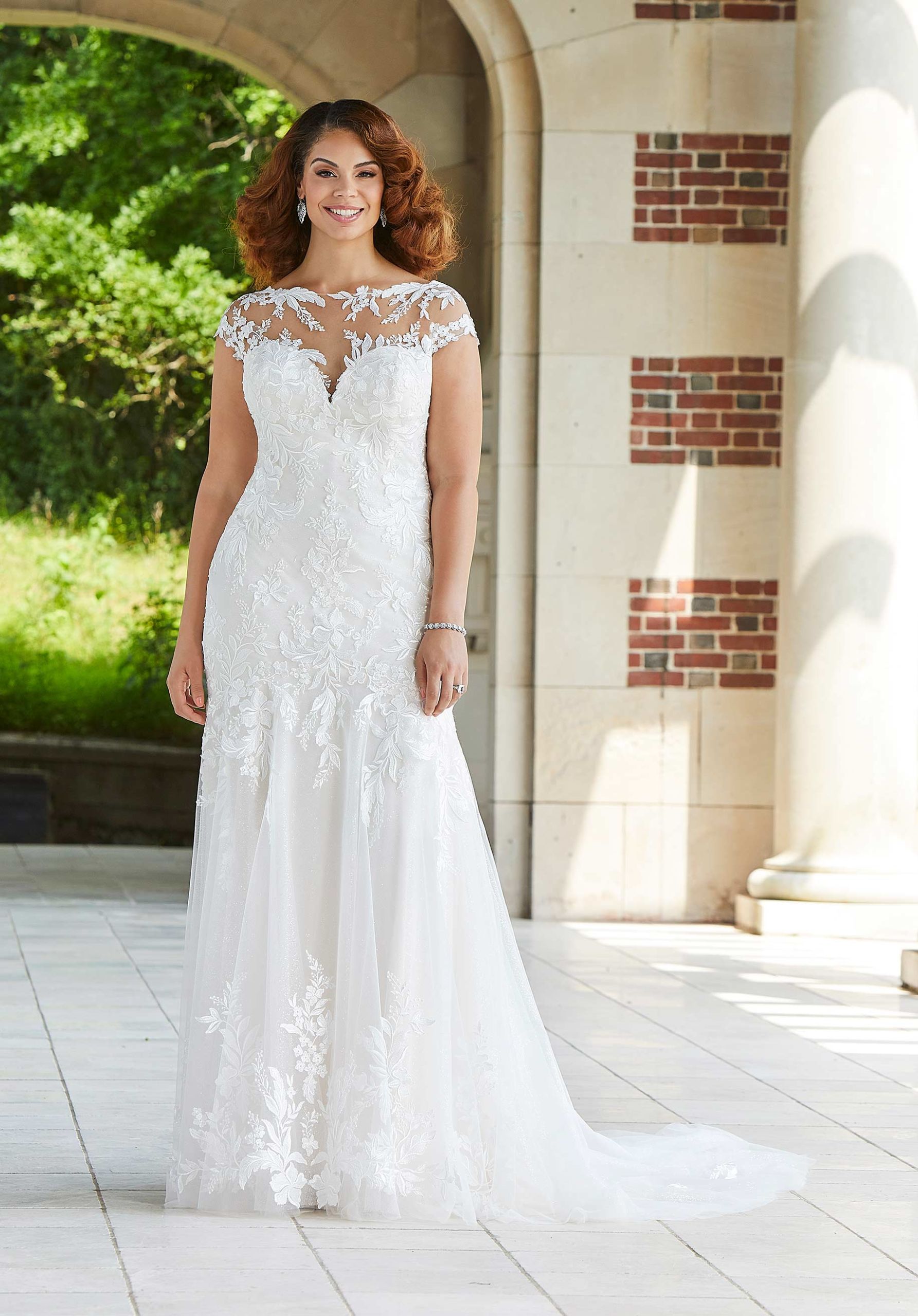 Home / Wedding Dresses / Morilee Wedding Dresses / Julietta Collection Wedding Dresses / 3348 Ellery - Morilee Wedding DressEllery is a soft mermaid featuring a modest illusion neckline with cap sleeves and stunning embroidered lace appliqués. The sparkle net fabric offers dimensional shimmer, but it’s the back that takes our breath away. An open scoop back with illusion detailing is show stopping but paired with a sheer, chapel train this dress is an absolute vision.