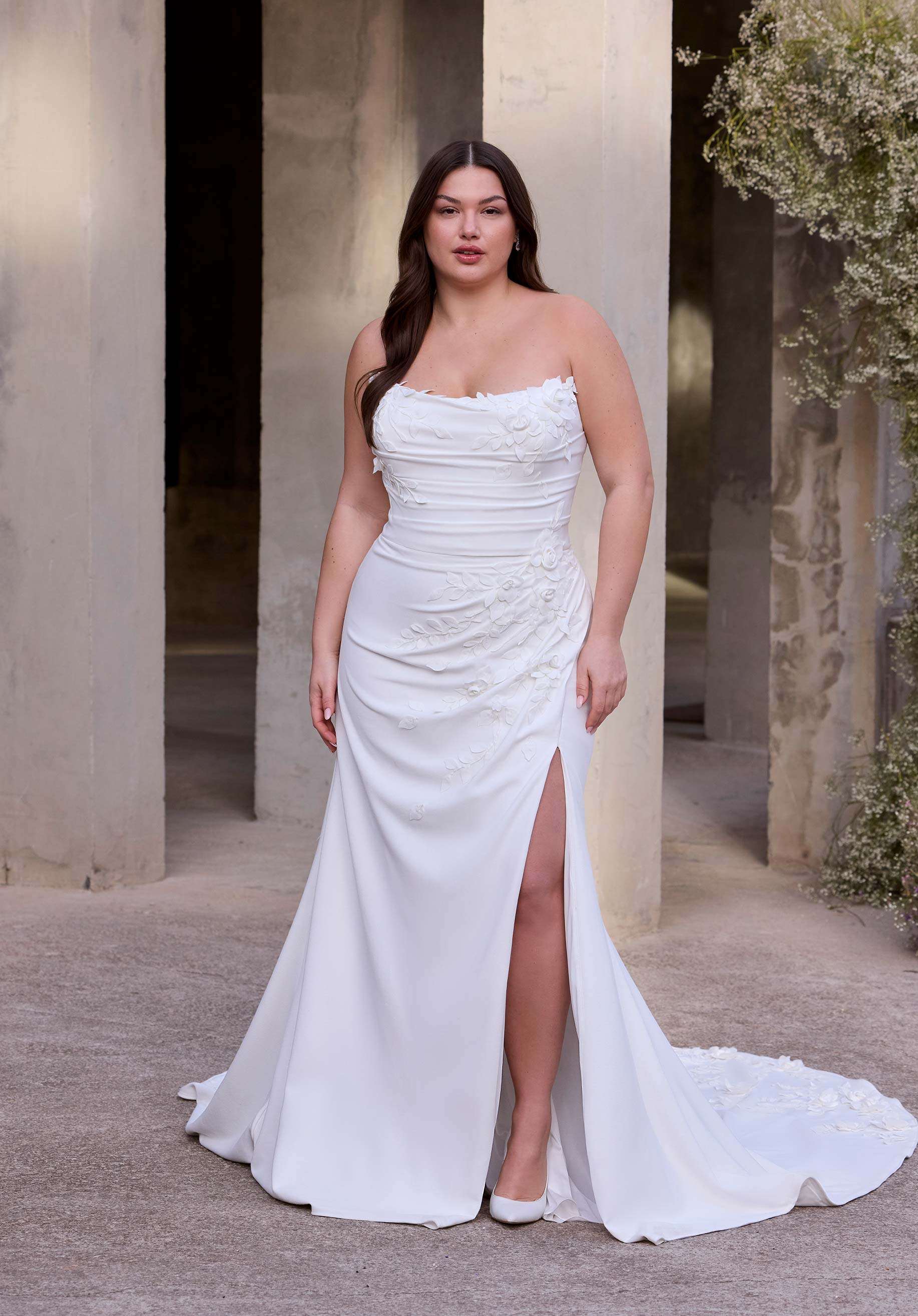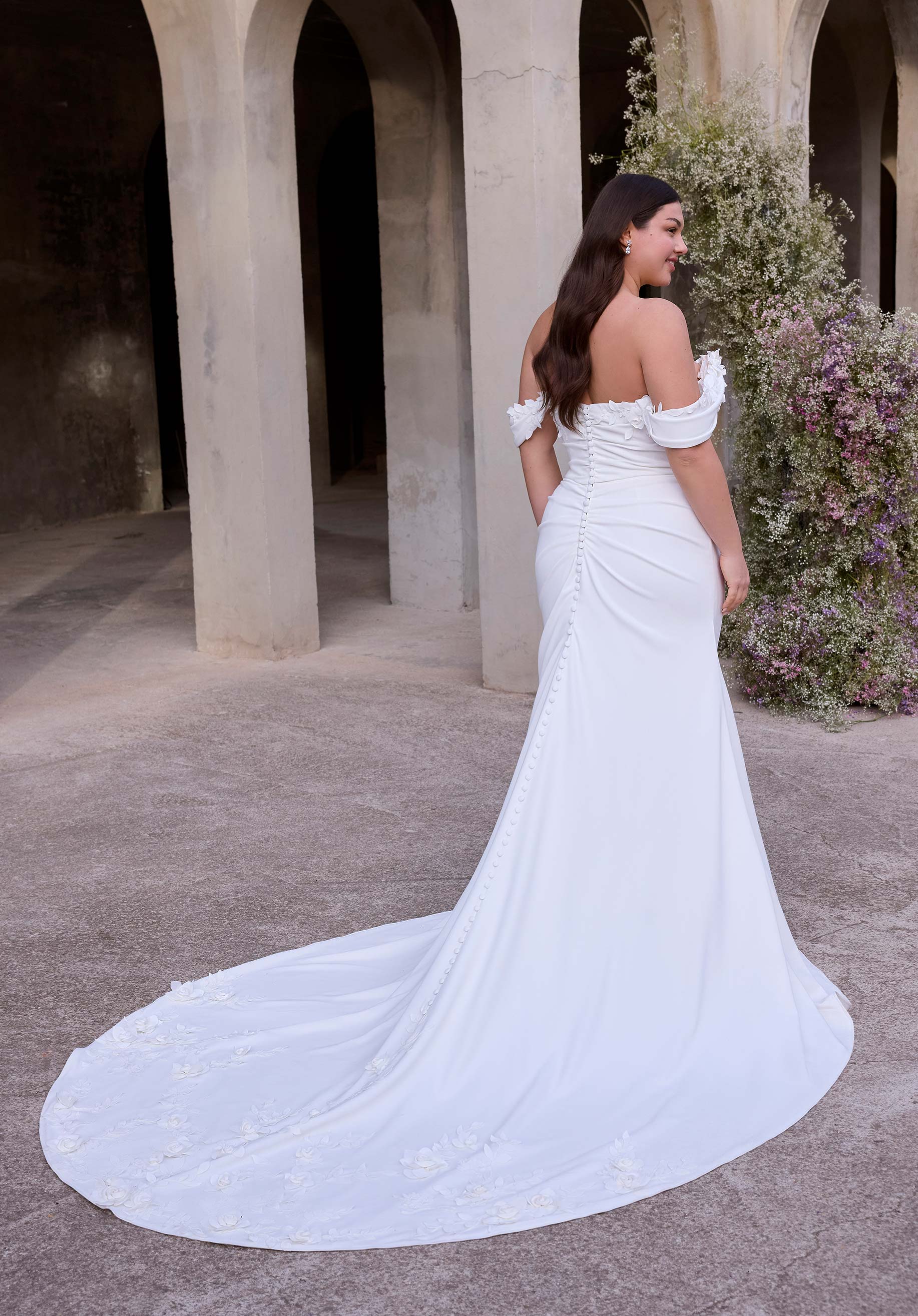 Sheath wedding dress has a strapless neckline with draped off-the-shoulder sleeves and 3D florals in crepe with a skirt slit.