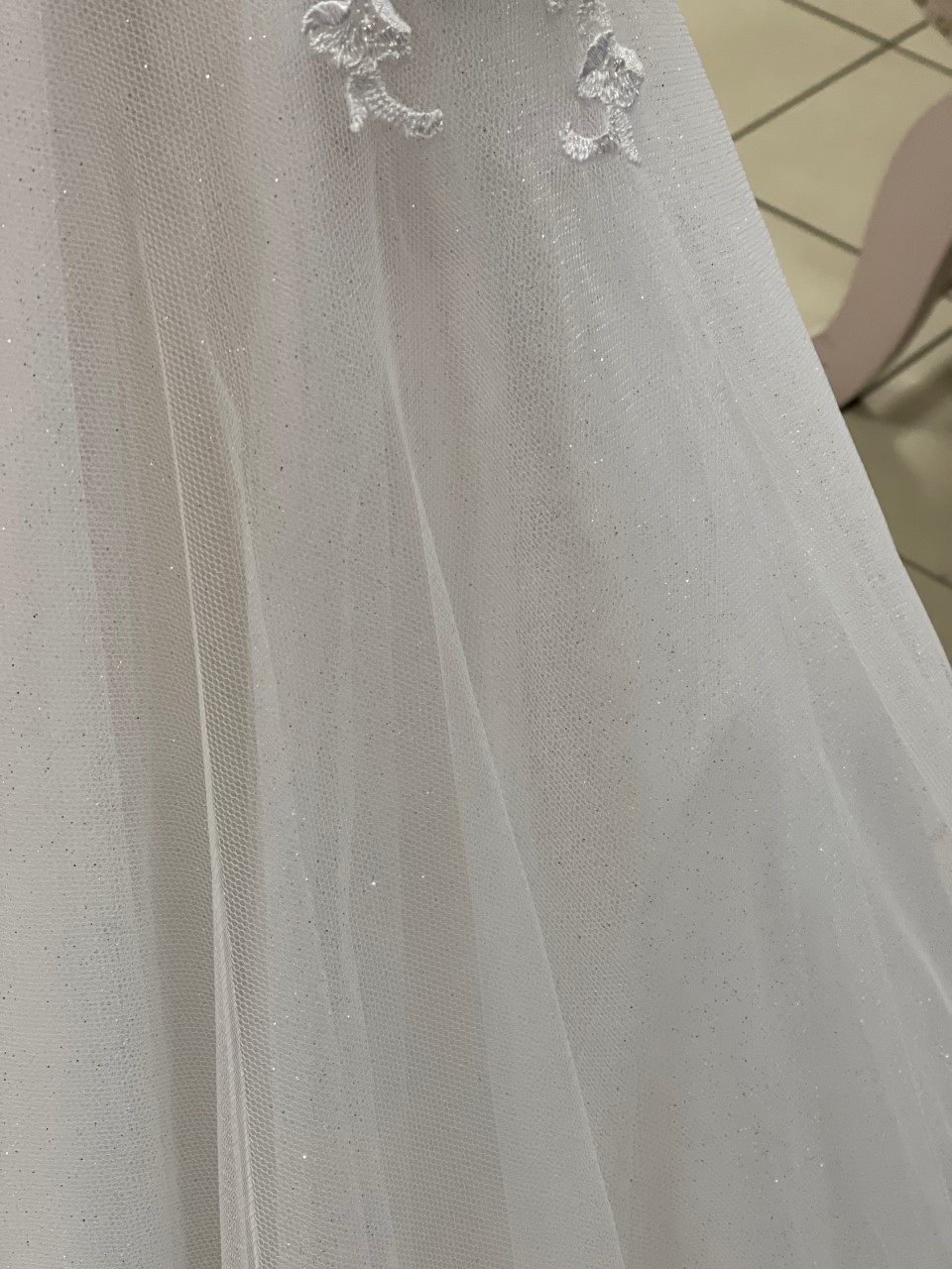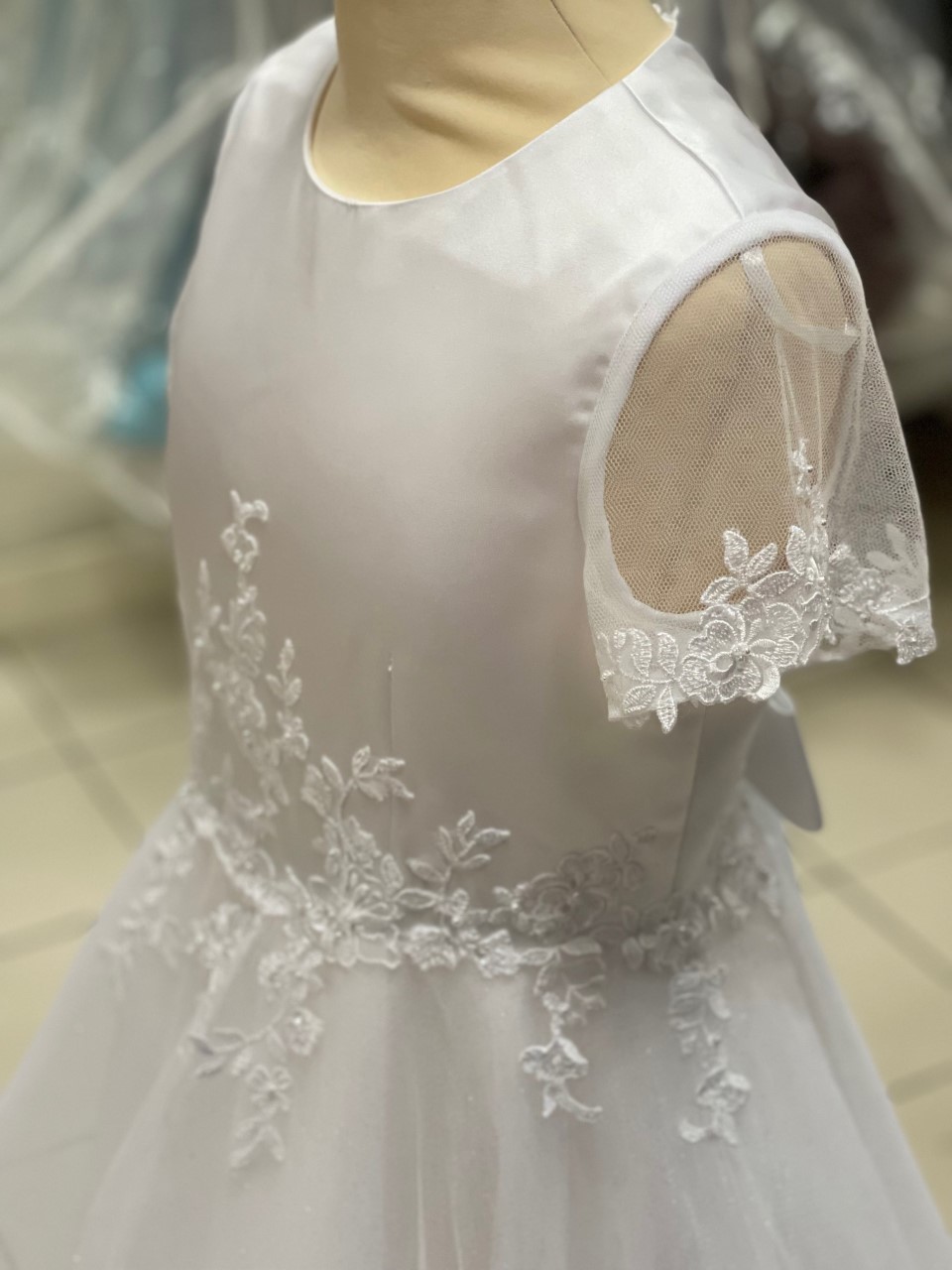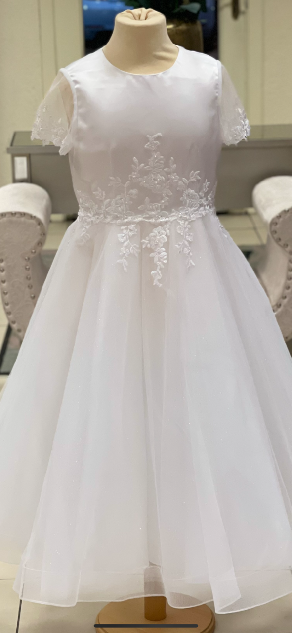 Pretty tulle dress with full sparkle skirt, appliques on the front and back of the dress and the sleeve