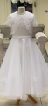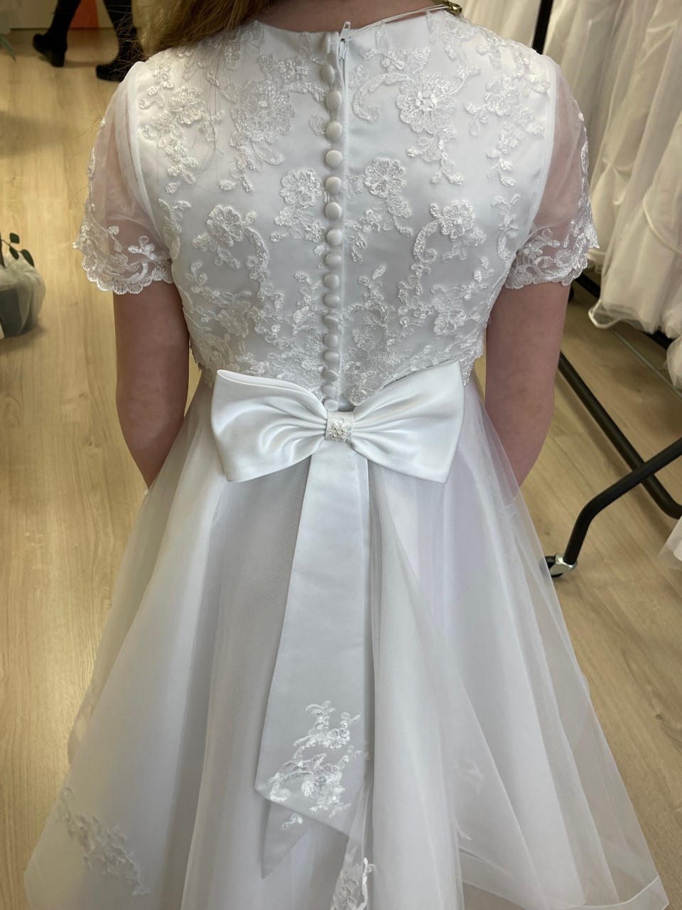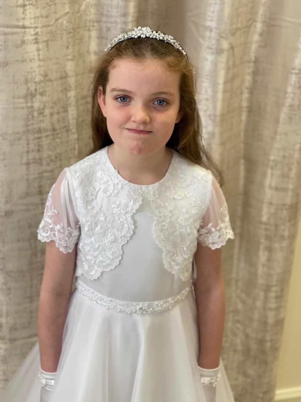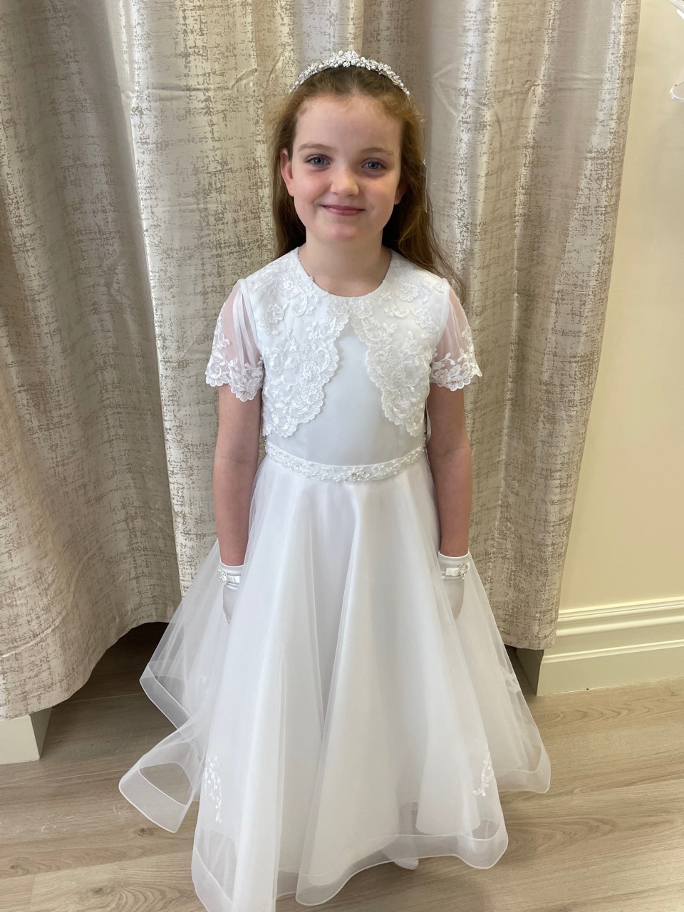 Beautiful communion dress with faux lace jacket detail, buttons and bow on back, Modelled by Lily