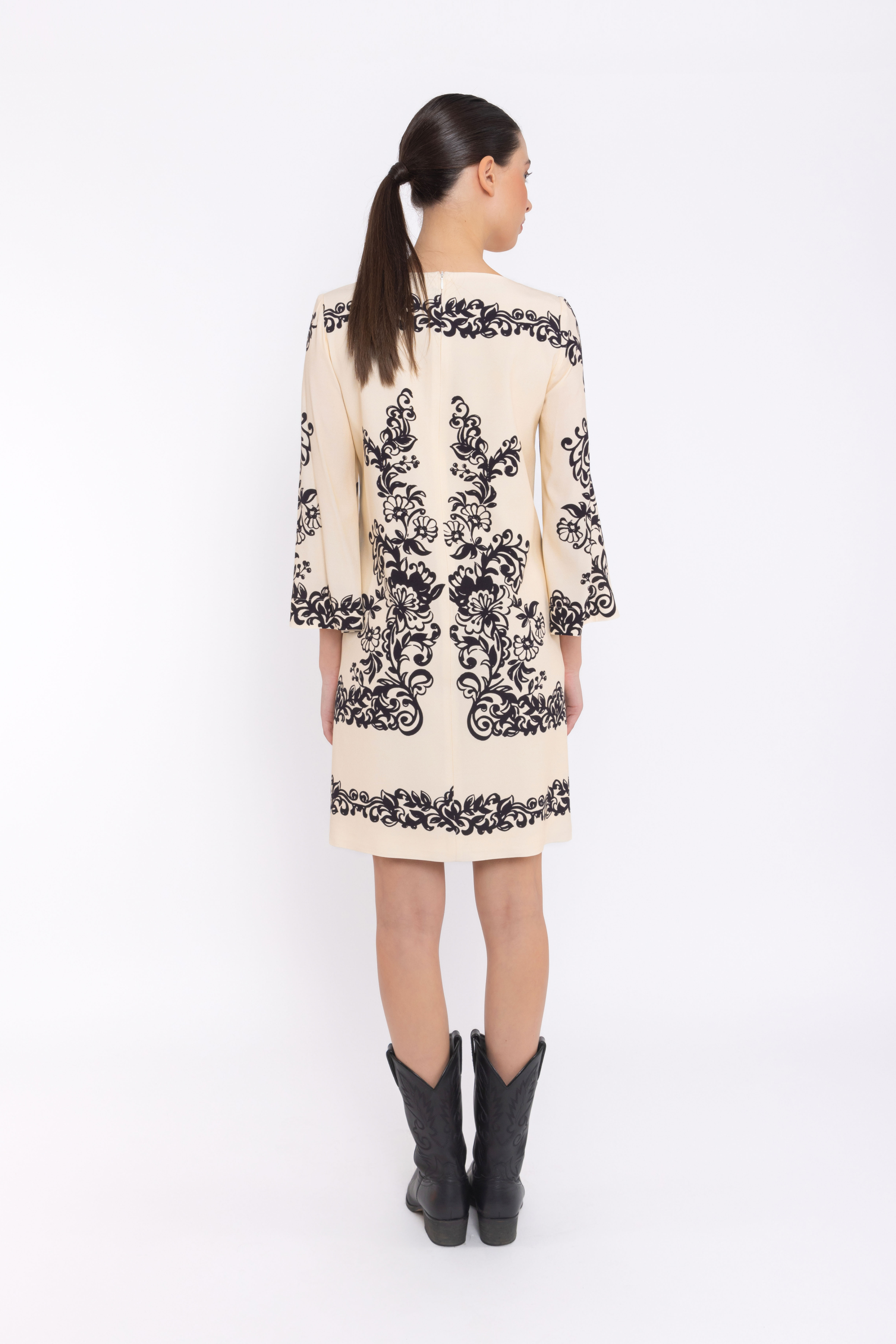 Home / Occasion Wear / Guest Wear for weddings or special occasions / 49065 Cream Aztec DressDesigned with a classic shift silhouette, it offers an easy, flattering fit that skims the body without clinging. The three-quarter length sleeves provide elegant coverage, while the delicate keyhole neckline adds a subtle feminine touch. Falling just above the knee, this dress is both sophisticated and versatile.