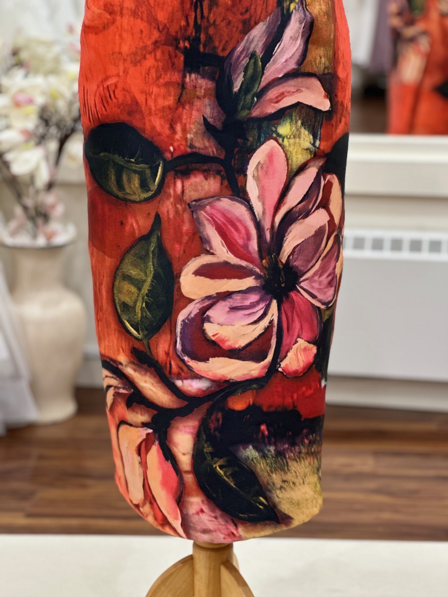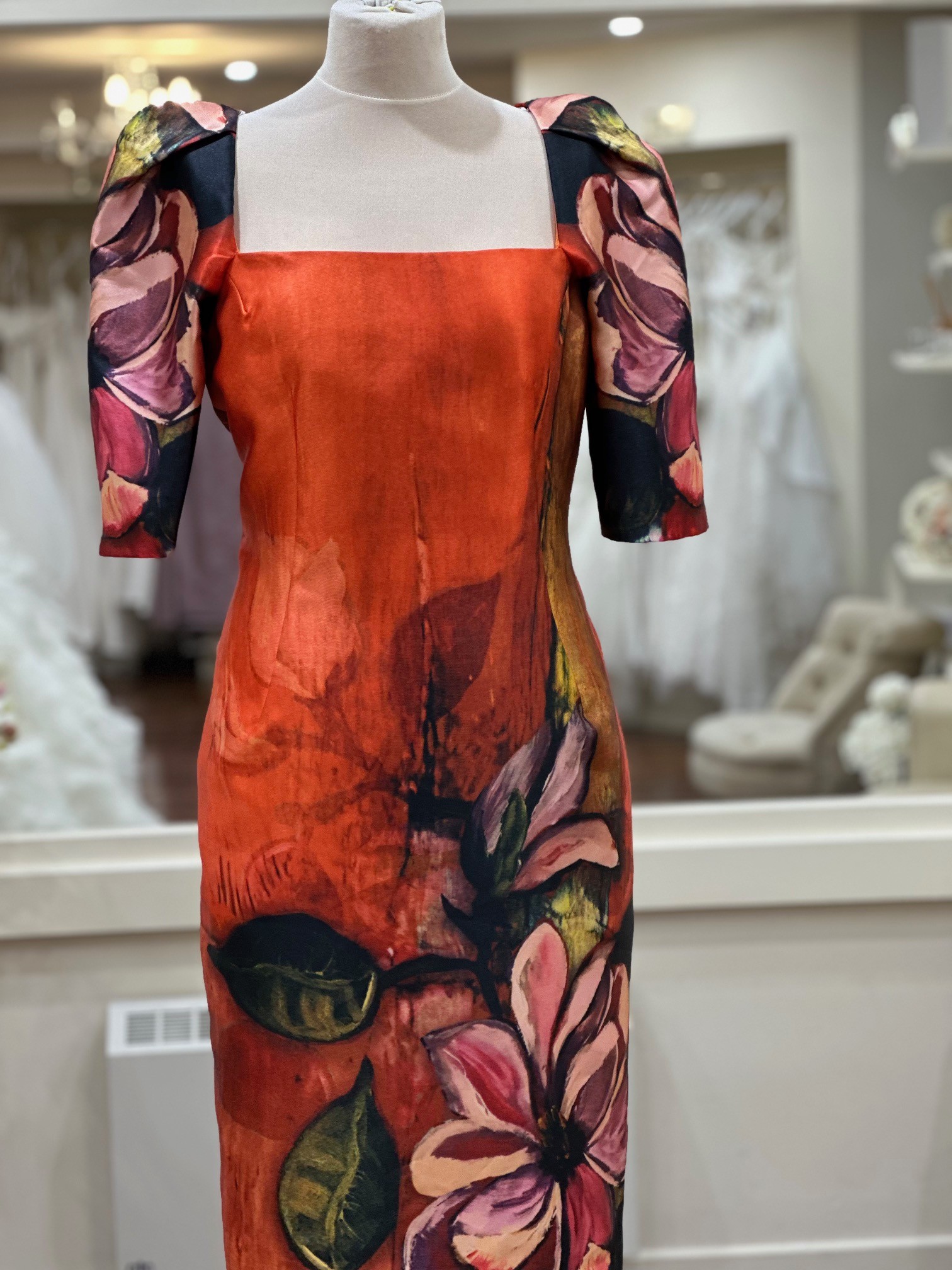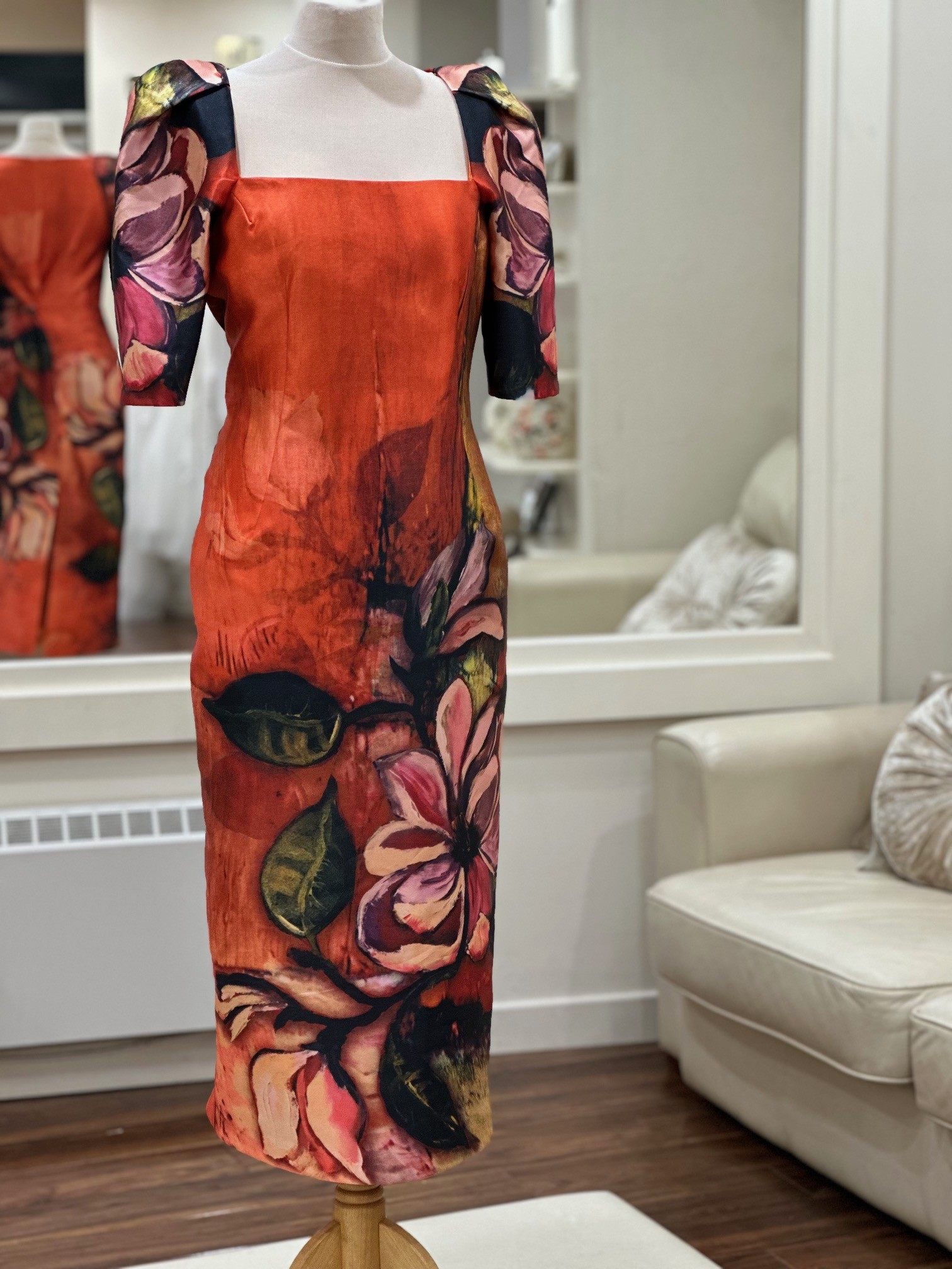 This striking occasion dress features a rich burnt-orange base adorned with an oversized floral print in soft pinks, plums, and olive greens, creating a dramatic yet romantic look. The square neckline offers a modern, structured feel, beautifully balanced by softly puffed elbow-length sleeves