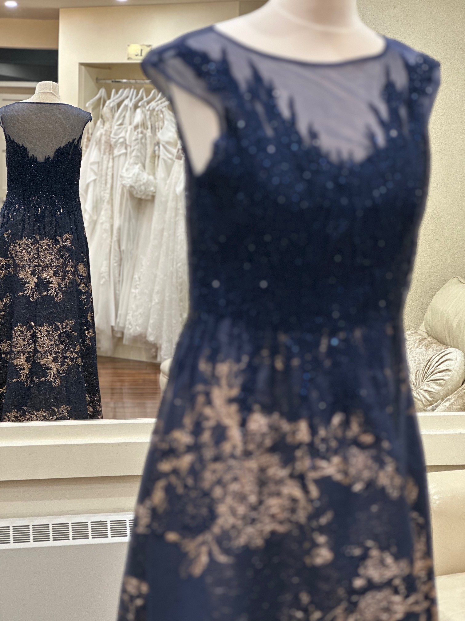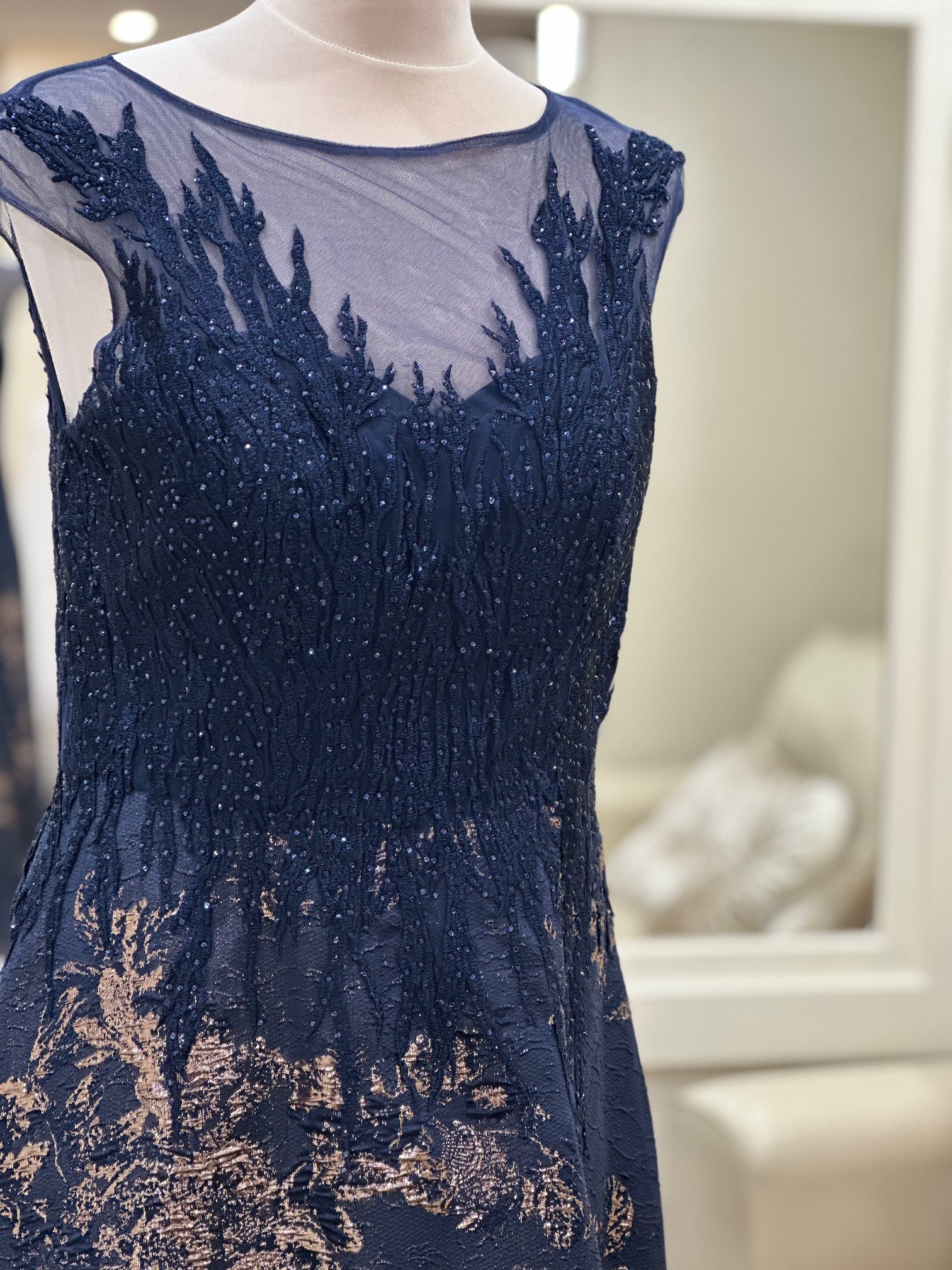 This striking floor-length gown combines navy with gold for a look that is timeless. The bodice features a sheer illusion neckline with delicate lace appliqué that softly frames the shoulders and décolletage, while beadwork adds a sparkle. The fitted waist creates a flattering silhouette before flowing into a full A-line skirt.
