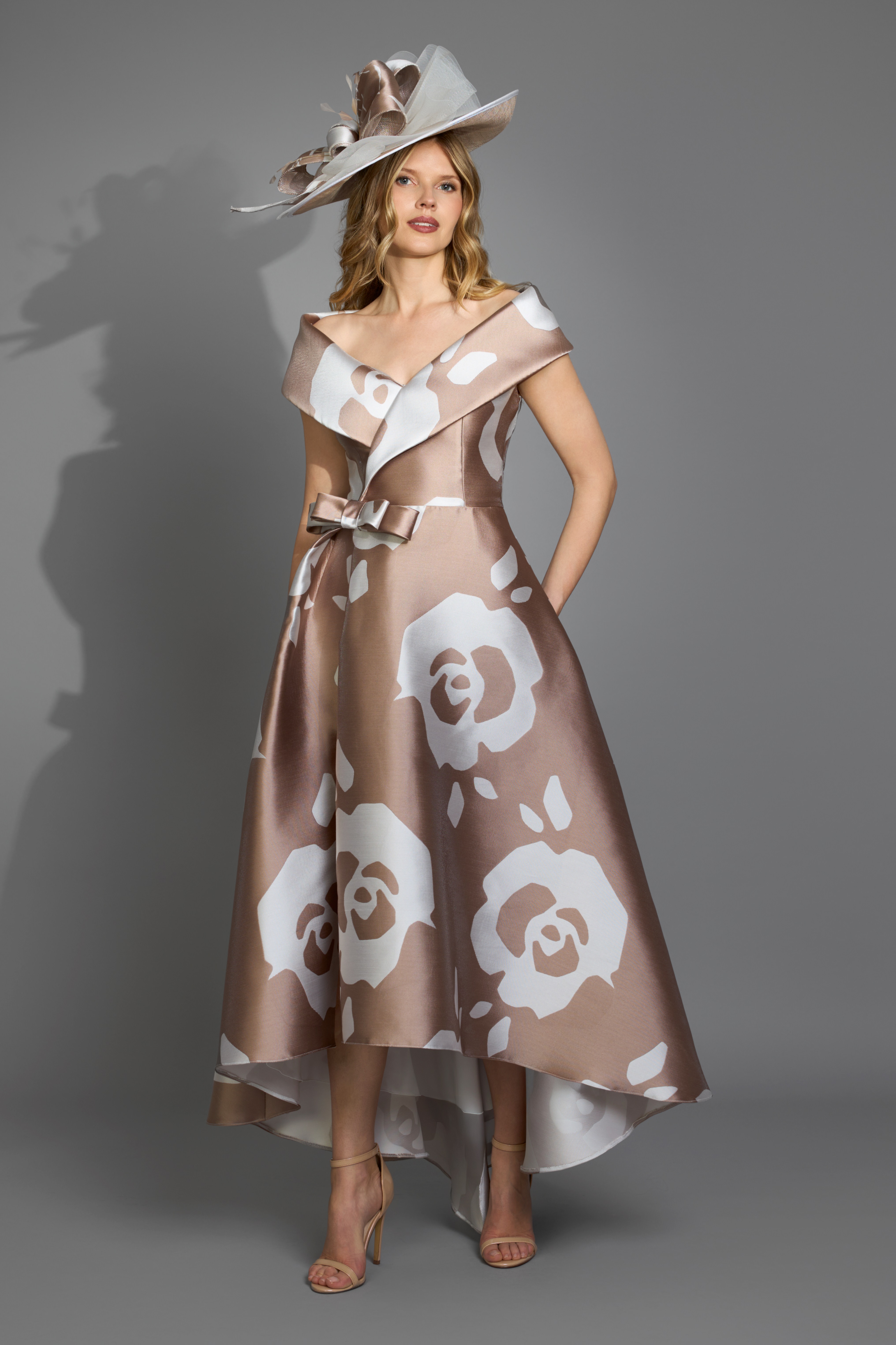 Another fabulous creation by Gabriela Sanchez. This biscuit and cream coloured dress has a wide neckline which in turn flatters the waist where a detachable diamanté bow catches the eye An A line full skirt with a dipped hem makes this a dress to turn heads in at any event