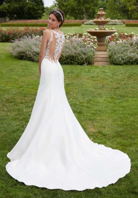 Home / Wedding Dresses / Morilee Wedding Dresses / Blu Collection Wedding Dresses / 5804 SANDY Wedding DressesThe Sandy wedding gown features stretch Larissa satin, A-line gown with sheer net back, accented with crystal and pearl beaded embroidery.