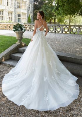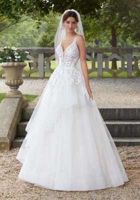 Home / Wedding Dresses / Morilee Wedding Dresses / Blu Collection Wedding Dresses / 5811 SAHARA Wedding DressesThe Sahara wedding gown features a tulle ball gown with flounced skirt overlay and horsehair edging. Details include crystal and pearl beaded straps and neckline trim with frosted embroidery.