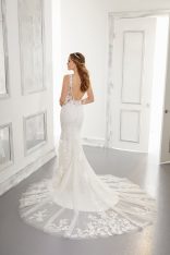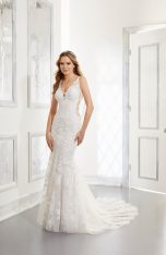 Home / Wedding Dresses / Morilee Wedding Dresses / Blu Collection Wedding Dresses / 5863 Alessia Wedding DressAccented with frosted embroidery, the fit and flare silhouette of the Alessia gown features a feminine V-neckline with center front Net inset. A gorgeous detachable chandelier back detail leads way to the cascading sheer, Tulle train.