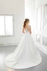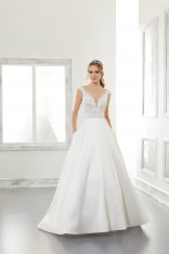 Home / Wedding Dresses / Morilee Wedding Dresses / Blu Collection Wedding Dresses / 5867 Adele Wedding DressFrosted Alençon lace beautifully accents the V-neck bodice on the Adele designer wedding dress. A breathtaking illusion back and sleek Larissa Satin A-Line skirt with pockets complete with look
