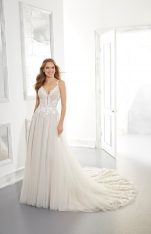 Home / Wedding Dresses / Morilee Wedding Dresses / Blu Collection Wedding Dresses / 5871 Aremis Wedding DressBoho meets luxe in our Artemis designer wedding dress. The V-neck bodice is accented with embroidered, organic appliqués and appliquéd straps that give way to the gorgeous keyhole back. A Soft Net A-Line ball gown skirt trimmed in Lace completes the dreamy look.