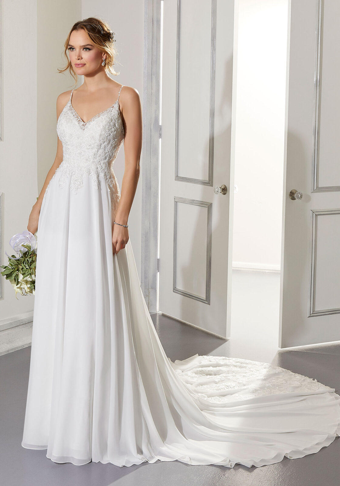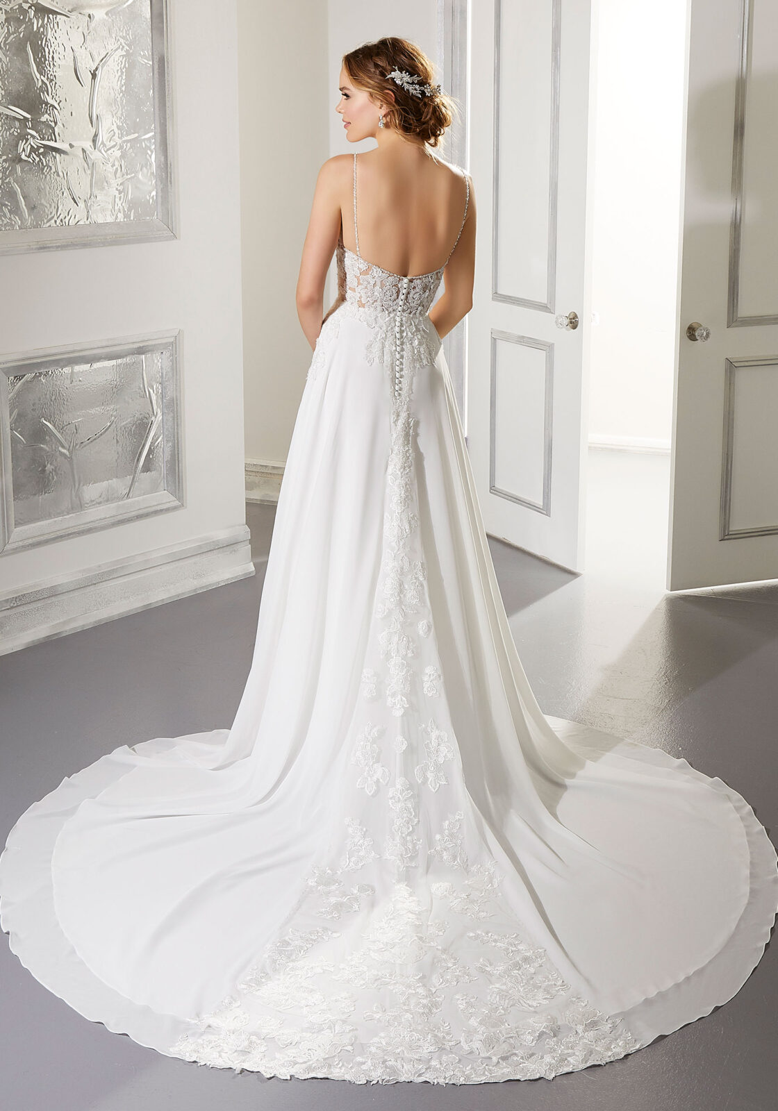 Home / Wedding Dresses / Morilee Wedding Dresses / Blu Collection Wedding Dresses / 5873 AILANI Wedding DressSoft and romantic, the Ailani designer wedding dress features an intricately beaded and embroidered V-neck, Lace bodice. A crystal beaded neckline and dainty spaghetti straps lead way to a gorgeous open back. The flowing A-Line Chiffon skirt with back Lace inset panel completes the look.