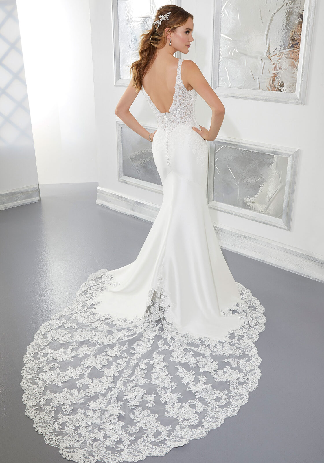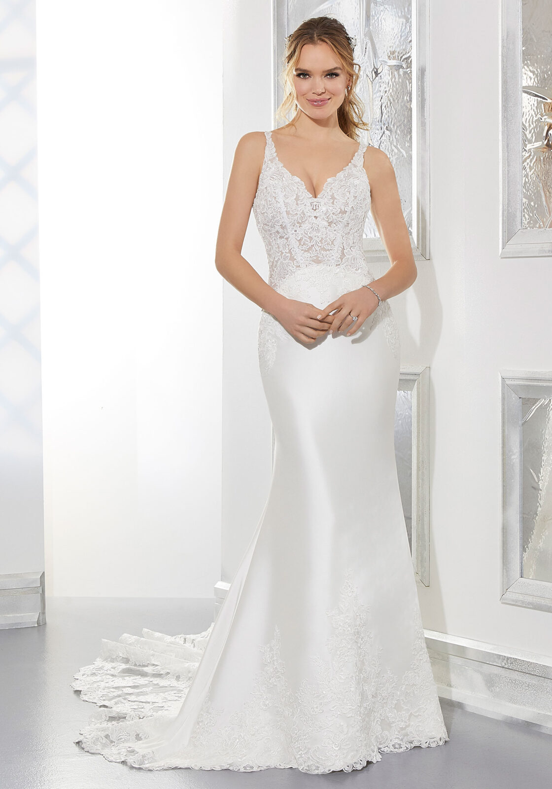 Home / Wedding Dresses / Morilee Wedding Dresses / Blu Collection Wedding Dresses / 5874 AMBER Wedding DressFrosted Alençon Lace appliqués accent the V-neck bodice and sultry Larissa Satin fit and flare silhouette on the Amber wedding gown. A wide scalloped hemline and cut-away train complete the look.