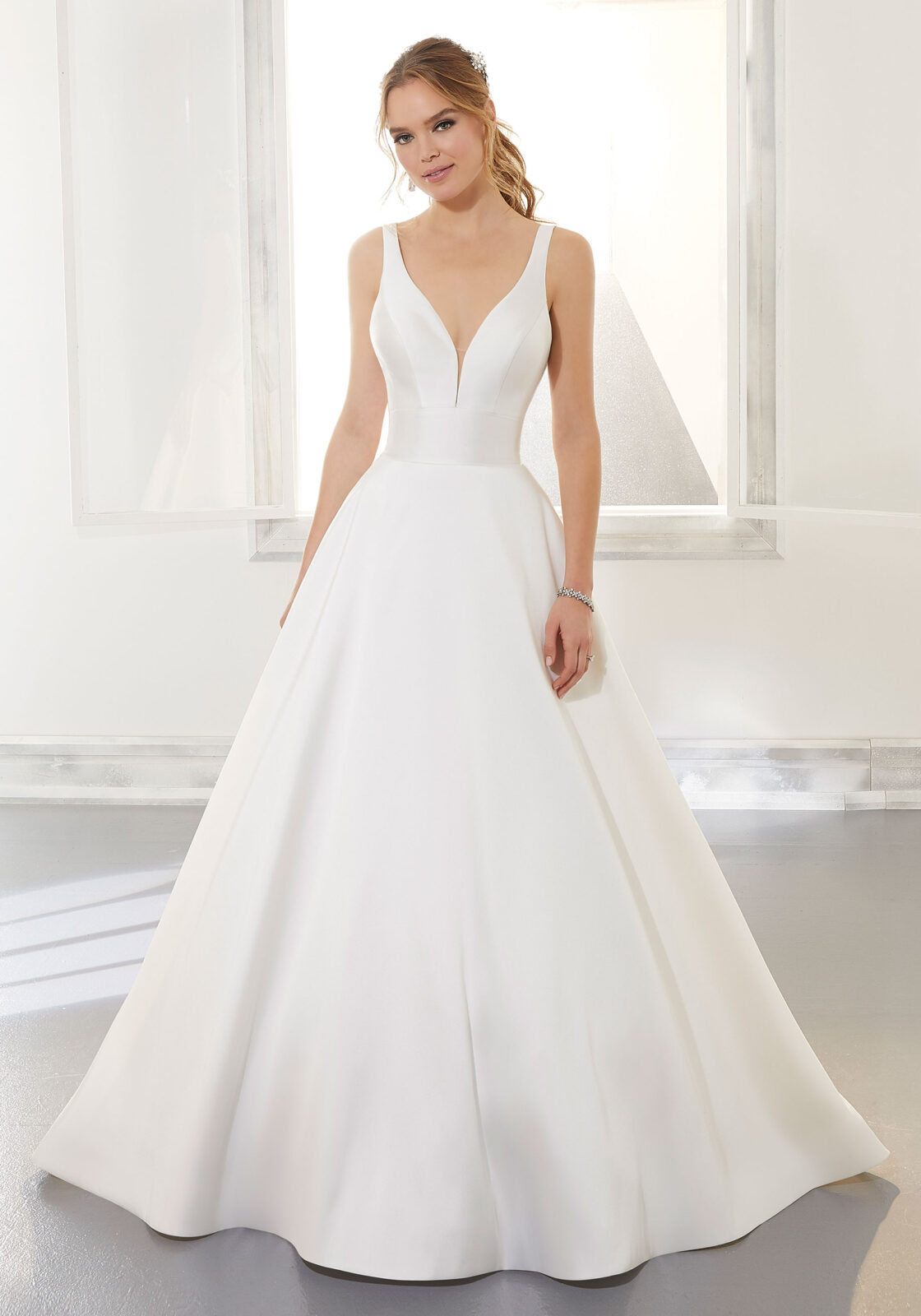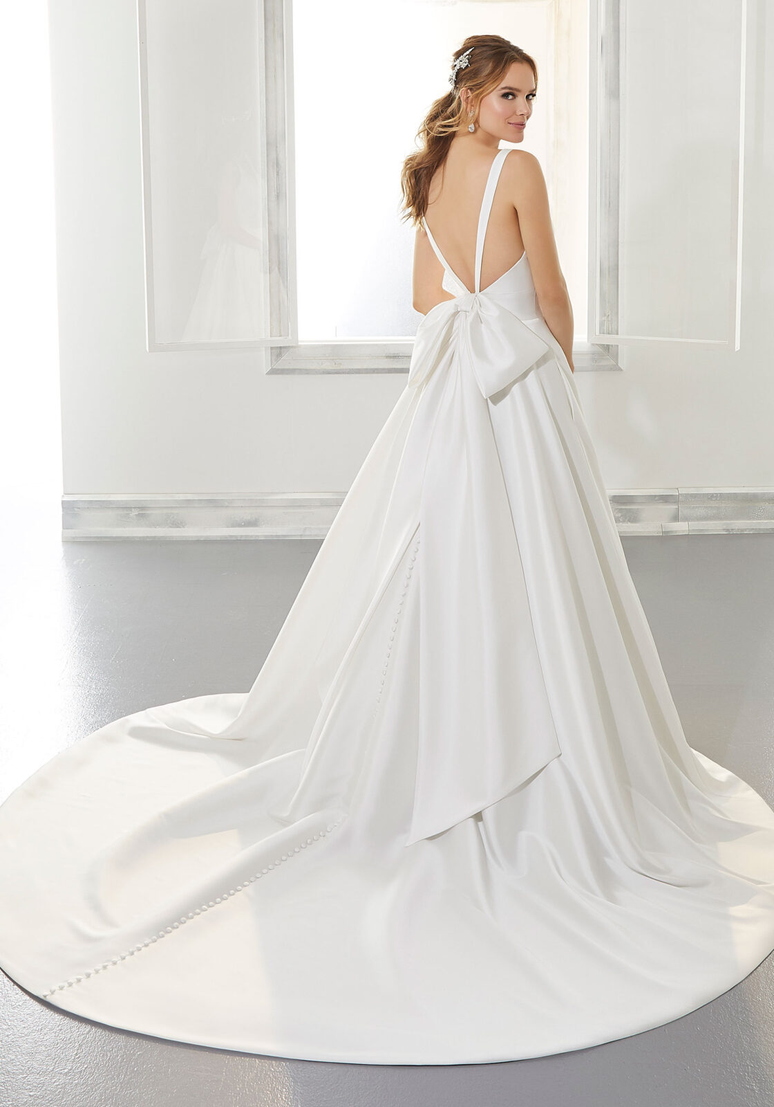 Home / Wedding Dresses / Morilee Wedding Dresses / Blu Collection Wedding Dresses / 5875 AMY Wedding DressSimply stunning, the Larissa Satin Amy gown features a classic A-Line silhouette with a Net neckline inset at the center front. Covered buttons trim the skirt to the hemline. A romantic detachable bow frames the open back and completes the look