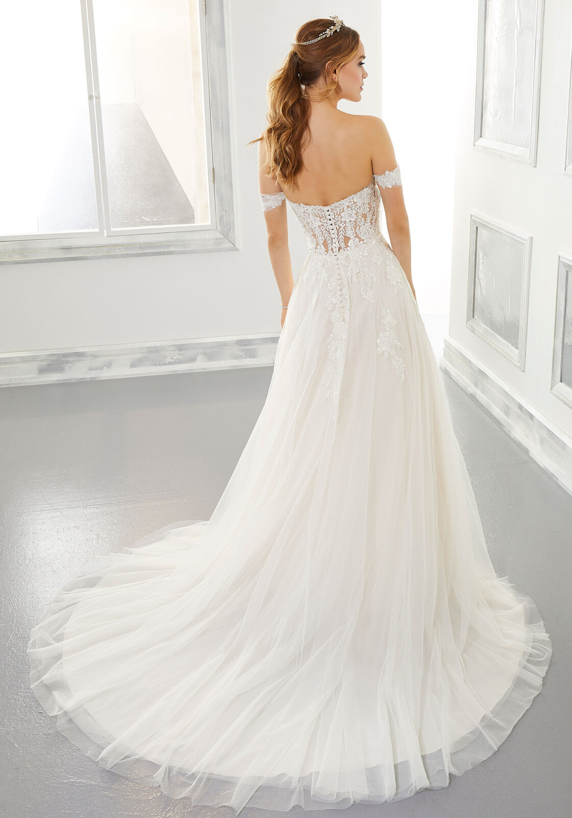 Home / Wedding Dresses / Morilee Wedding Dresses / Blu Collection Wedding Dresses / 5878 ARWEN Wedding DressCrystal and pearl beaded, frosted Lace appliqués beautifully frame the sweetheart bodice and romantic cap sleeves of our Arwen wedding gown. The sheer back trimmed in covered buttons and soft Tulle A-Line ball gown skirt complete the look. This gown can be worn with or without the detachable sleeves.