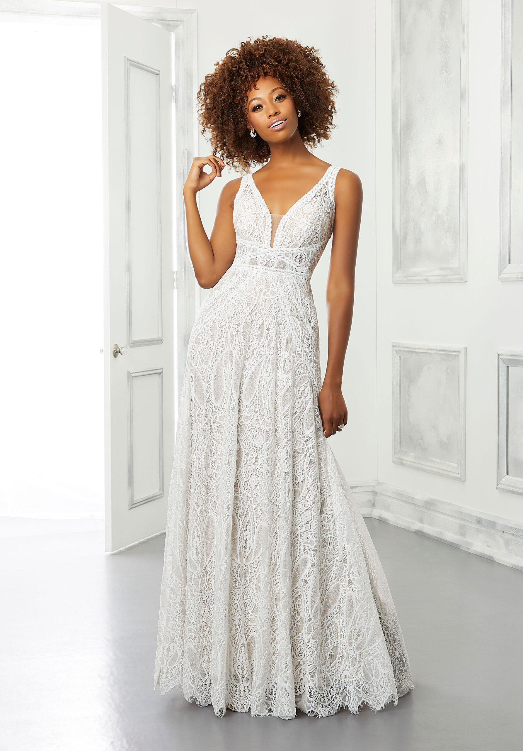 Home / Wedding Dresses / Morilee Wedding Dresses / Blu Collection Wedding Dresses / 5905 BROOKE Wedding DressOur Brooke wedding dress is a boho inspired beauty with its effortless A-line silhouette and intricate Lace. Accented by braided Lace trim and straps that double in the back to create a geometric back detail. A fine scalloped hemline and sheer train complete this free-spirited look.