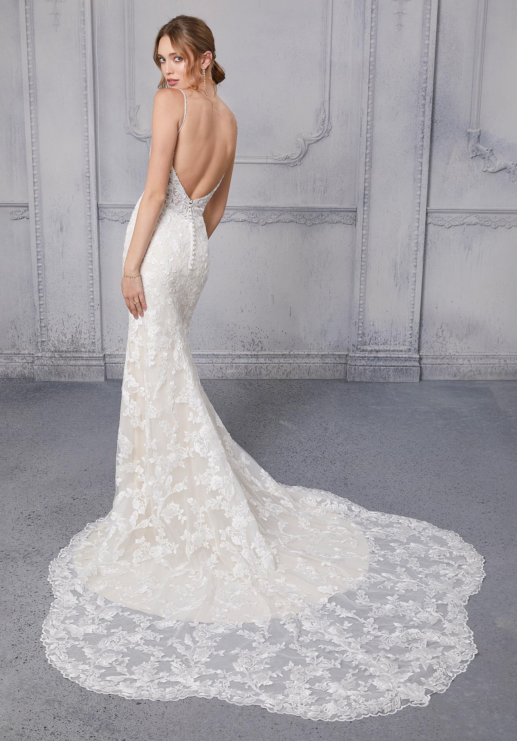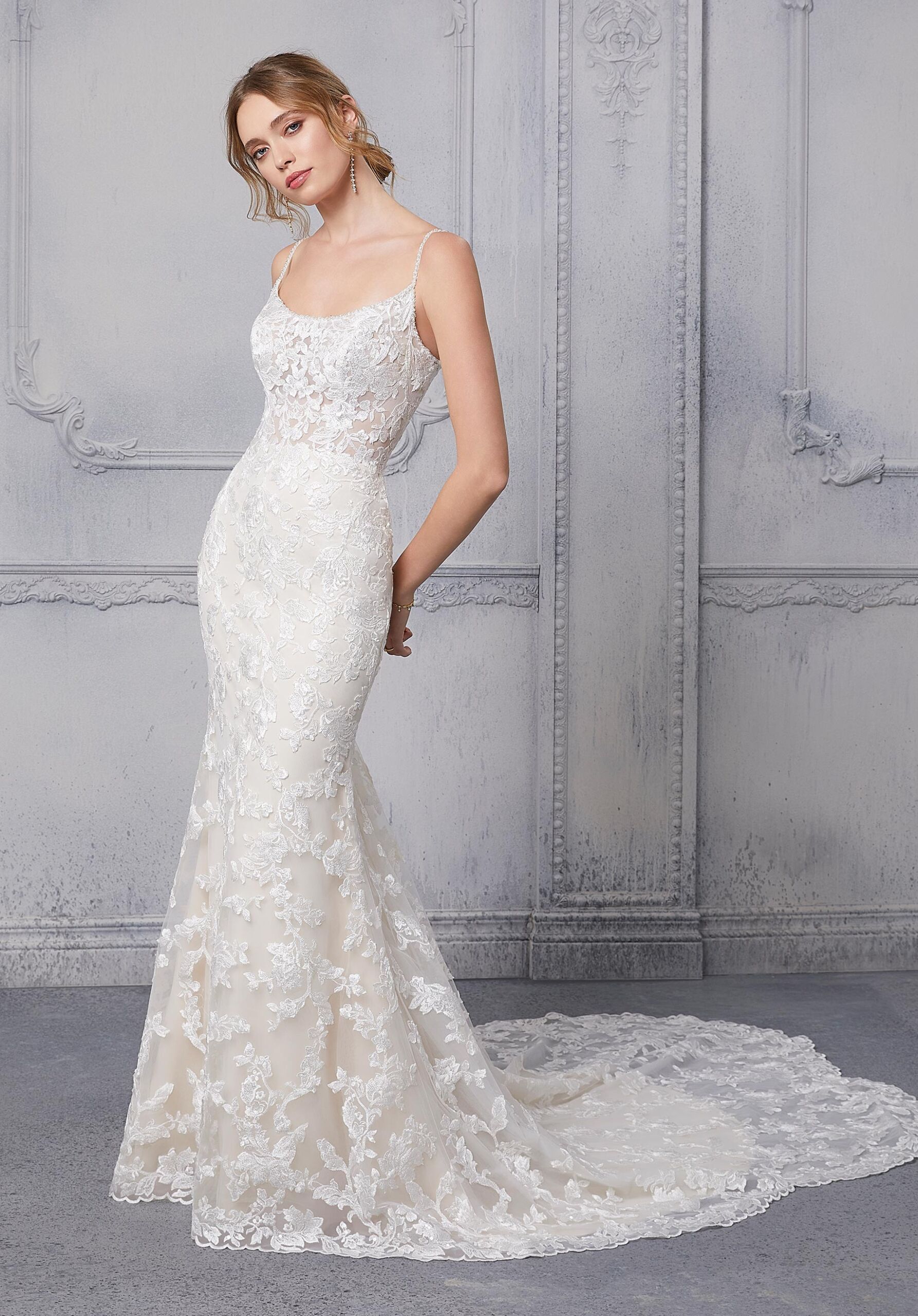 Home / Wedding Dresses / Morilee Wedding Dresses / Blu Collection Wedding Dresses / 5914 ClaudineClaudine is the perfect gown for brides who want subtle drama. The fitted shape accentuates your figure, while the allover frosted embroidery packs a punch of sweet sophistication. The soft scoop neckline is accented with dazzling crystal beaded trim and straps that lead to an exposed, open back. A sheer and dainty petal train completes the look.