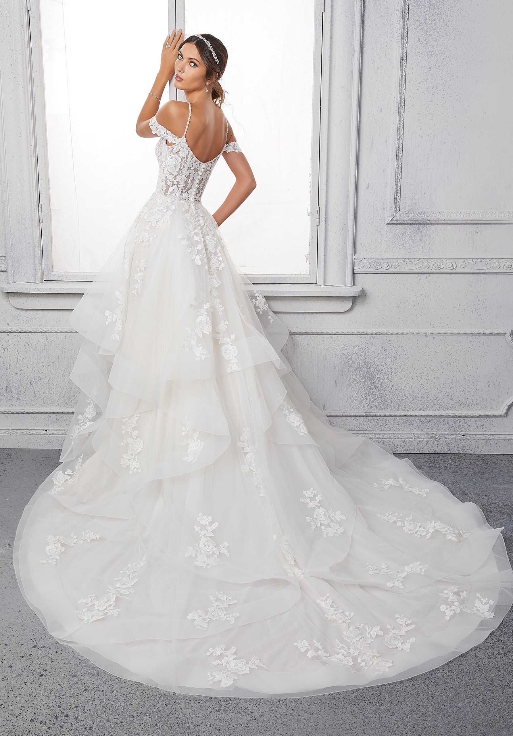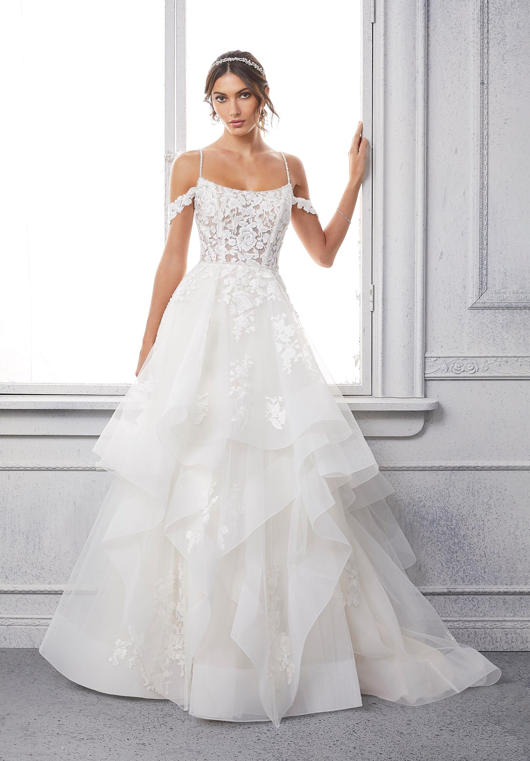 Home / Wedding Dresses / Morilee Wedding Dresses / Blu Collection Wedding Dresses / 5918 CaressaA romantic gown with modern finishes, Caressa will bring out all your beauty. The fabulously flounced tulle ball gown will be perfect to twirl the night away and the frosted, floral lace appliqués give a fresh, feminine touch. Iridescent pearl and crystal beaded straps and trim give the dress the sparkle that every bride needs, while the detachable, off-the-shoulder straps allow for a unique and customizable look