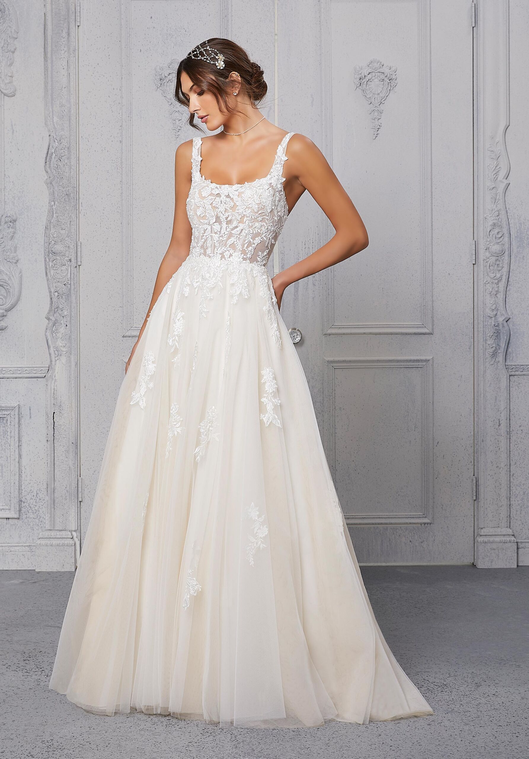 Home / Wedding Dresses / Morilee Wedding Dresses / Blu Collection Wedding Dresses / 5923 CassandraWe get fairytale feels looking at our Cassandra wedding dress. From the sheer, boned bodice full of sparkling crystal beaded, embroidered lace, to the soft tulle A-line, ball gown skirt. With chic details like the square neckline and open back, she’ll be a dream to walk down the aisle in.