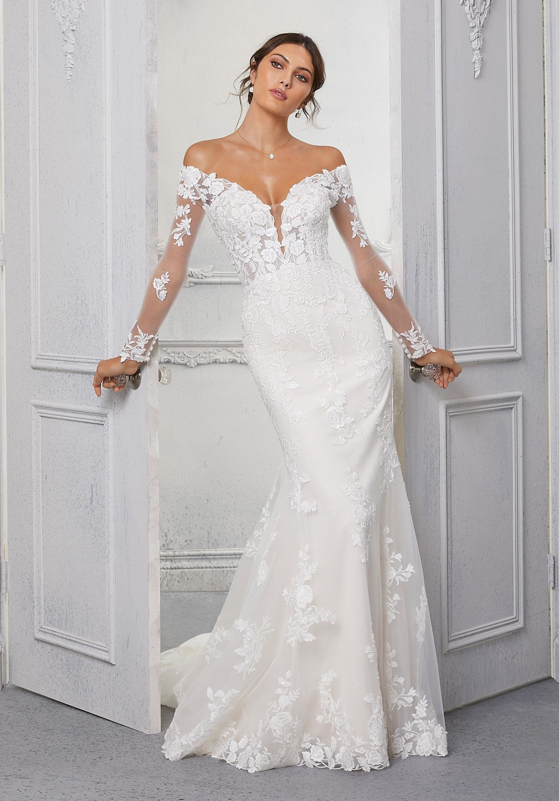 Home / Wedding Dresses / Morilee Wedding Dresses / Blu Collection Wedding Dresses / 5924 CindyClassic meets contemporary in our Cindy designer wedding dress. We can’t stop staring at the romantic frosted, embroidered appliqués that decorate the tulle over glitter tulle gown. From the sophisticated off-the-shoulder neckline to the immaculate illusion back, and sultry fit and flare shape, Cindy is a gown that has it all