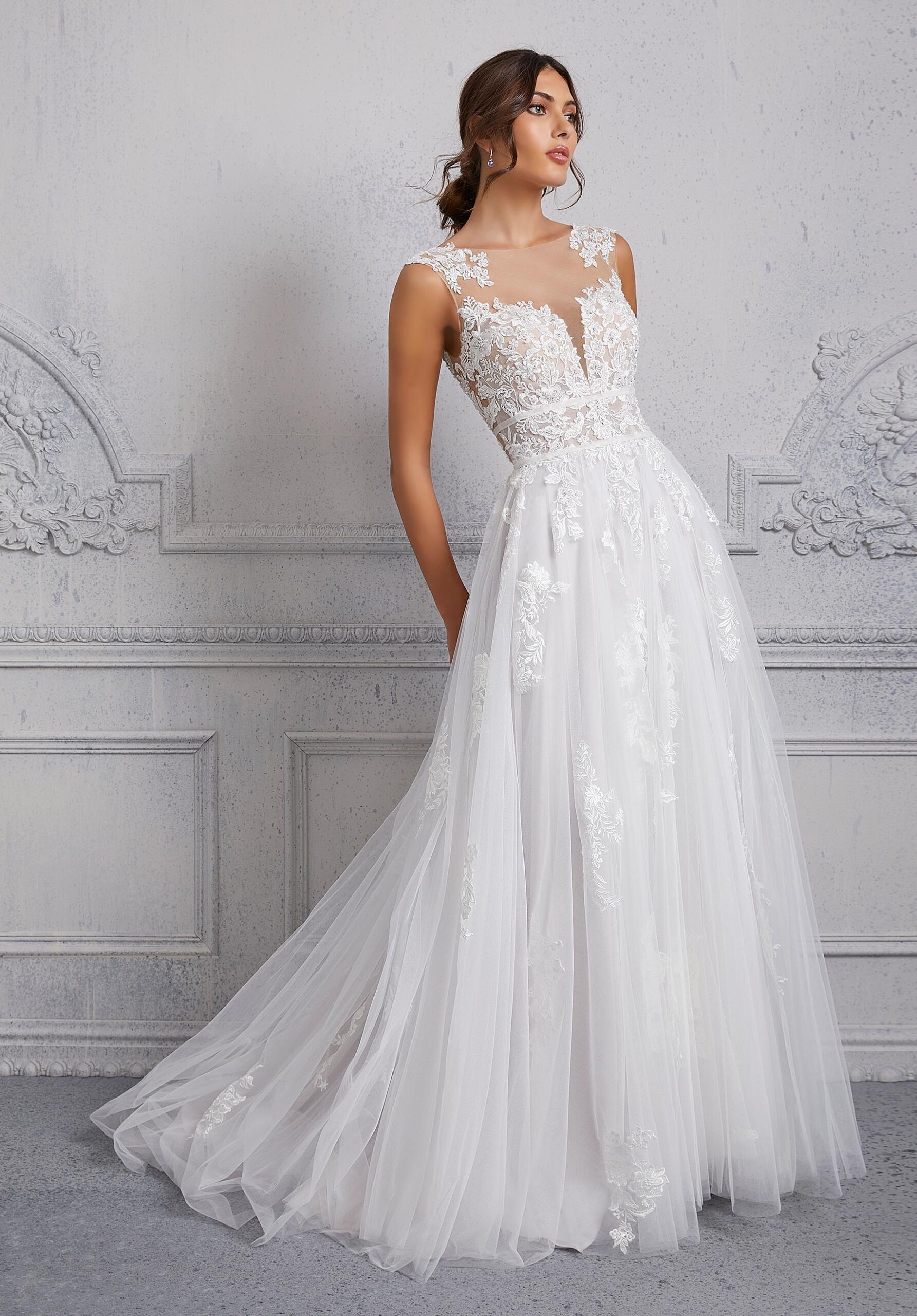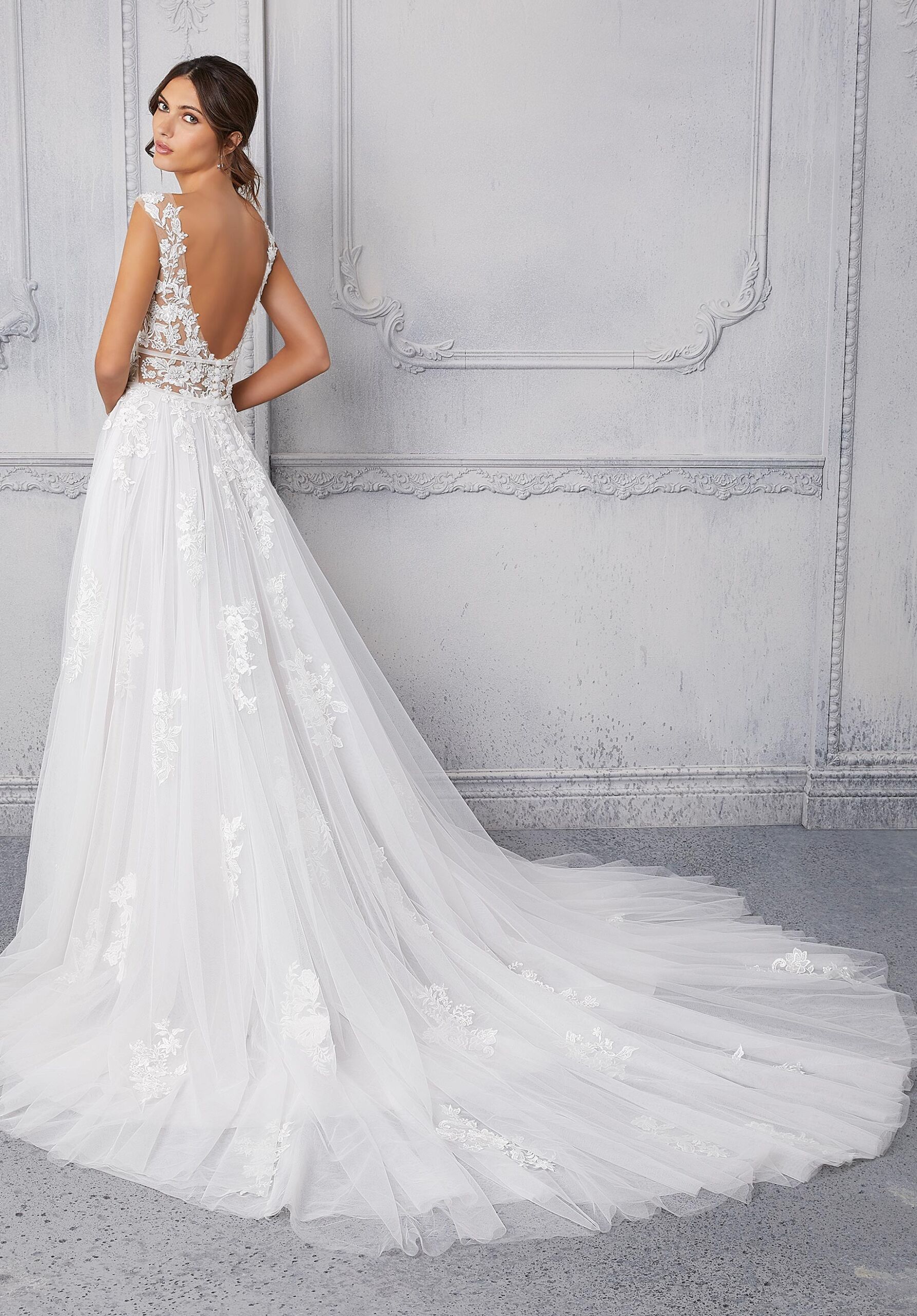 Home / Wedding Dresses / Morilee Wedding Dresses / Blu Collection Wedding Dresses / 5926 ChristineChristine will take your breath away with her angelic details. The beautiful bodice features delicate crystal beaded embroidery with a lovely illusion neckline and open scoop back. The double waistband helps to cinch you in, creating an elegant shape and the ethereal, sheer train will glide down the aisle.