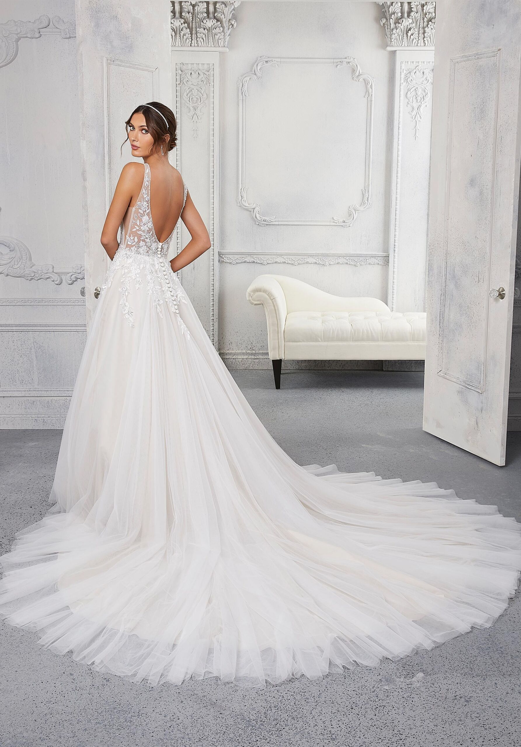 Home / Wedding Dresses / Morilee Wedding Dresses / Blu Collection Wedding Dresses / 5927 CelesteA divine beauty, our Celeste designer wedding dress is otherworldly. The sheer, plunging v-neck bodice is full of dimensional crystal beading on embroidered appliqués, and beaded trim, to help you sparkle like the stars in the sky. The A-line net ball gown floats off the body for an effortless and elegant look