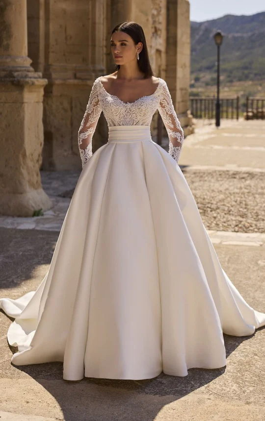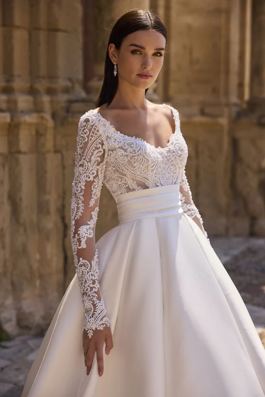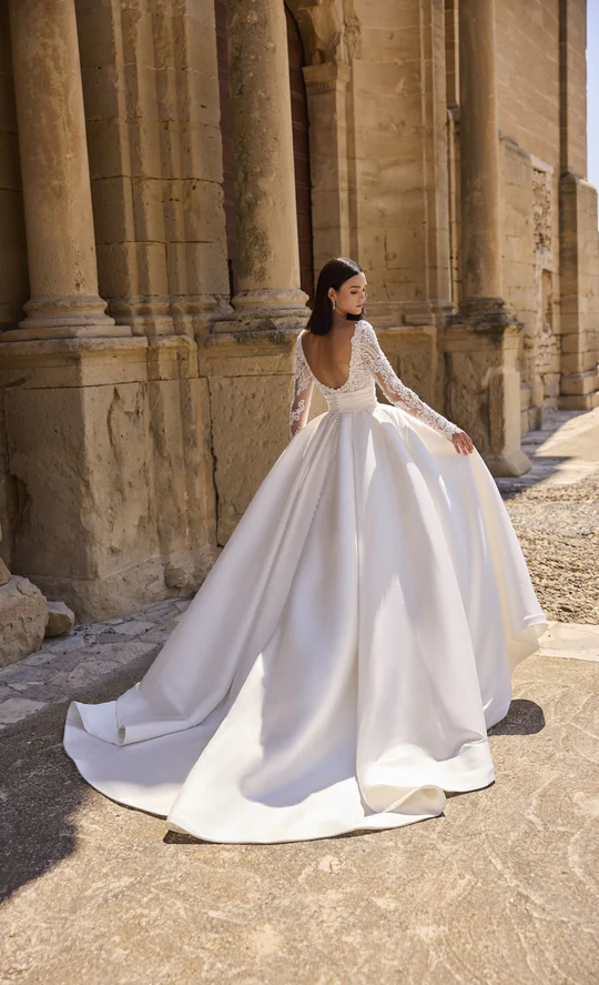 A timeless Mikado ballgown wedding dress, featuring a wide v-neckline and lace beaded bodice. This dress is complete with an open back, bridal button and cinched waist.