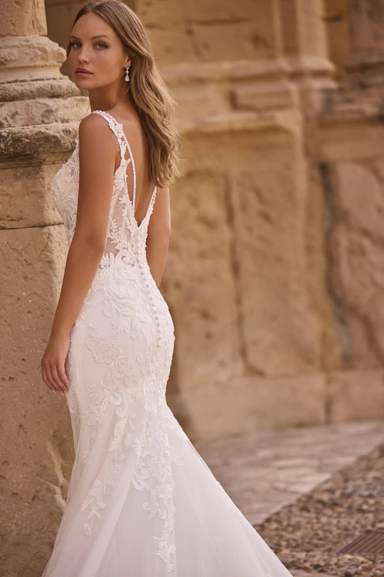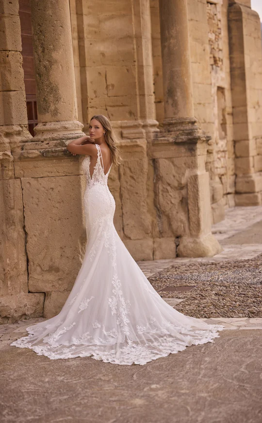 A stunning fit and flare lace wedding dress, with a deep v-back and sheer illusion side panels. This dress is complete was a deep v-neckline and scallop lace train Dress & Stole Shown with Veil Sold Separately as Style 63022