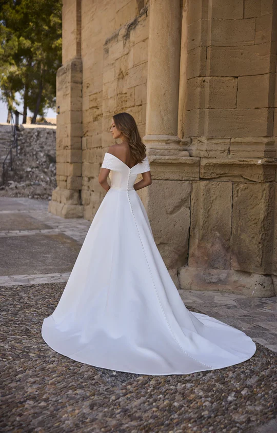 An elegant princess ballgown wedding dress, featuring a beaded off-the-shoulder neckline, a v-backline and bridal buttons