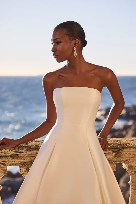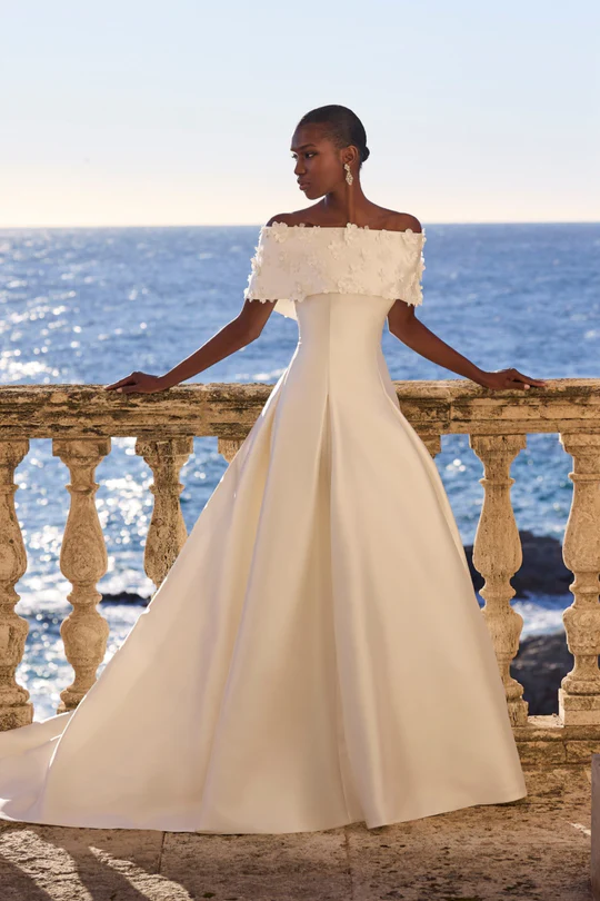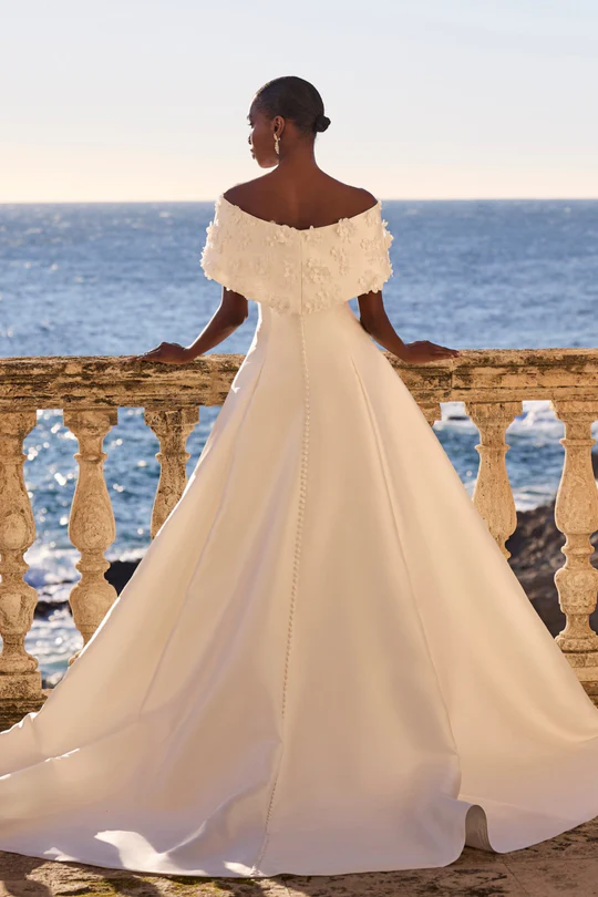 A timeless and elegant strapless mikado wedding gown, showcasing a breathtaking 3D floral wrap. This exquisite dress is finished with neatly arranged bridal buttons. Dress and Wrap with 3D Flowers
