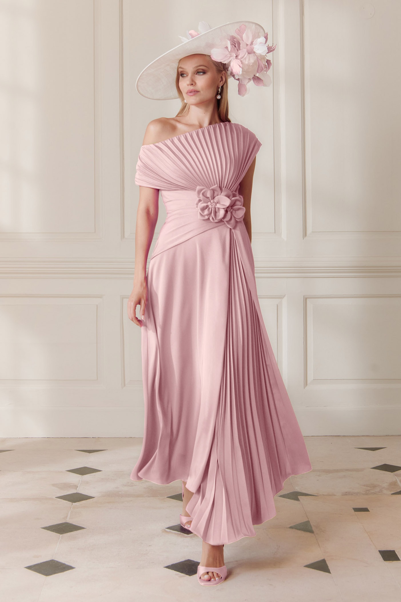 Crafted in a soft, fluid fabric, the dress features a beautifully structured one-shoulder neckline with delicate pleating that fans gracefully across the bodice. The asymmetric neckline creates a flattering, feminine silhouette while offering sophisticated coverage.