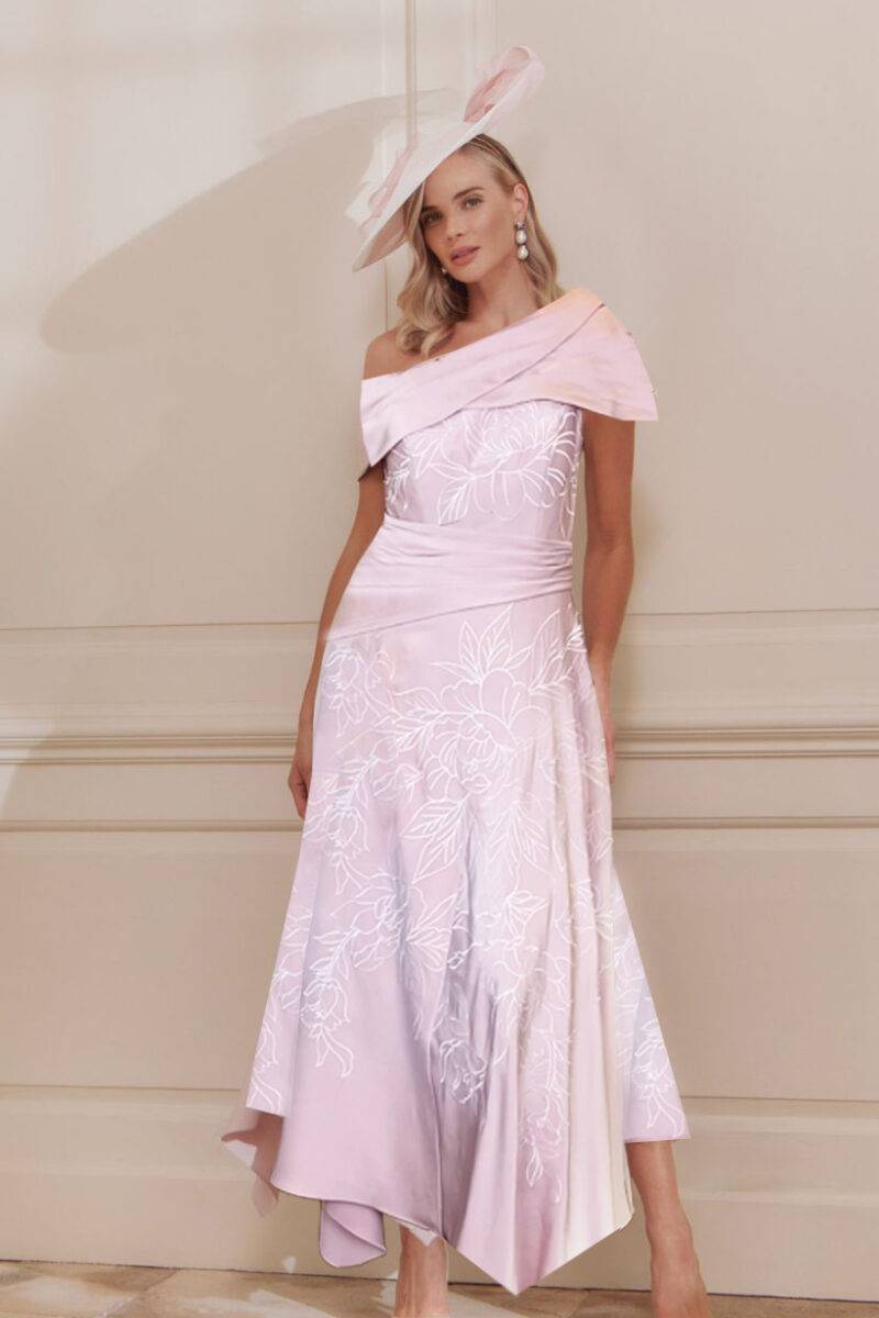 Designed in a soft, romantic pastel tone, the dress features a flattering off-the-shoulder neckline with a structured fold-over detail that beautifully frames the collarbone. The fitted bodice is adorned with delicate floral embroidery, adding subtle texture and a touch of femininity.