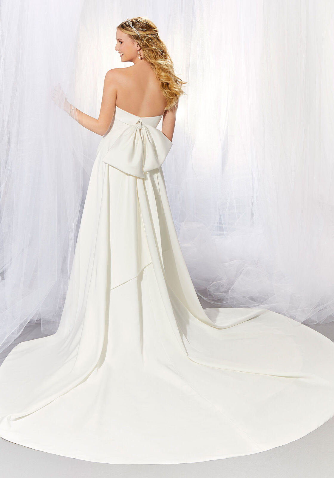 The Ava designer wedding dress is all about classic, clean lines. Featuring a sophisticated strapless neckline and Larissa Satin fit and flare silhouette. Covered buttons and a romantic detachable back bow trim the back and complete the chic look