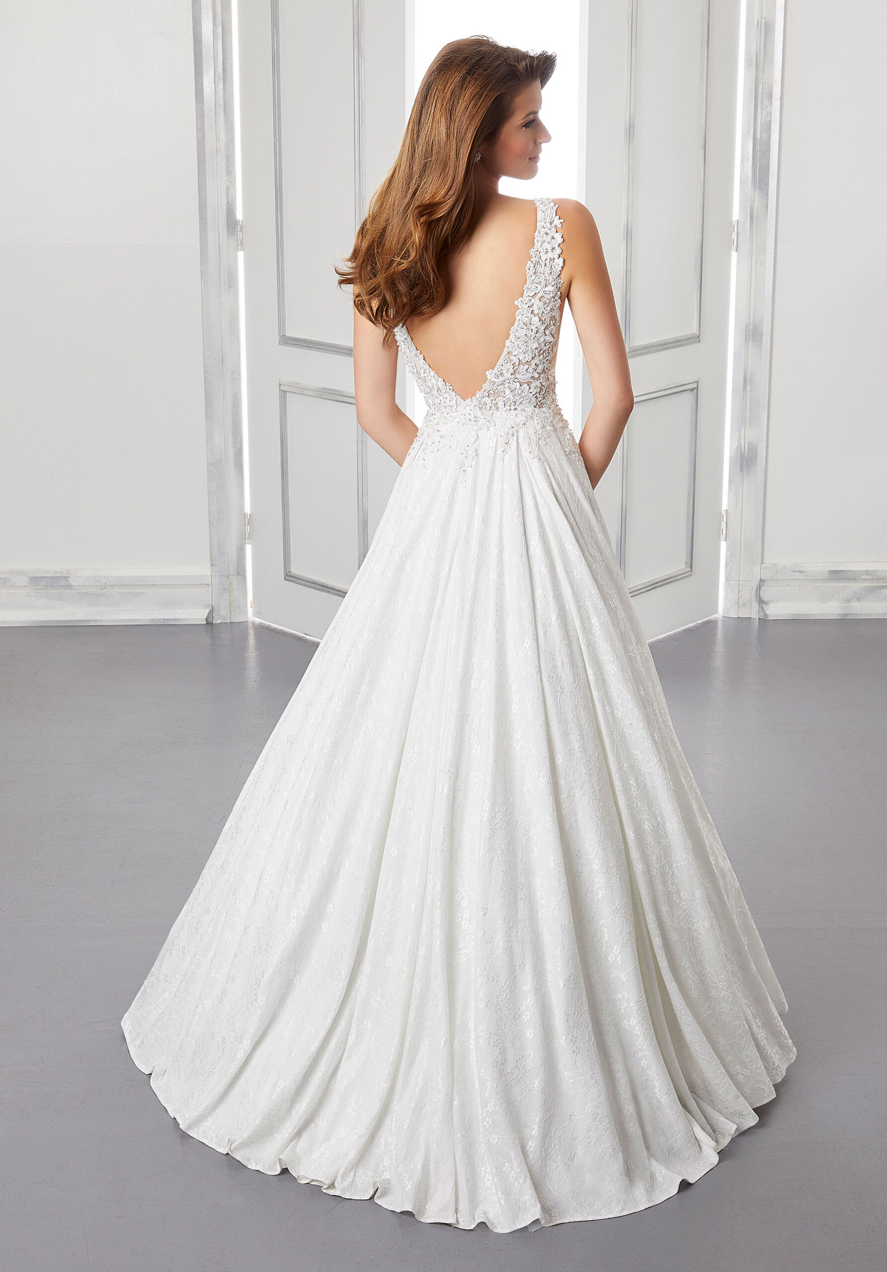 Glamour meets romance in our Betsey gown. The plunging v-neck bodice is covered in diamanté and crystal beaded Alençon lace appliqués that cascade into a full, metallic lace A-line gown. An open v-shaped back neckline finishes of this gorgeous gown